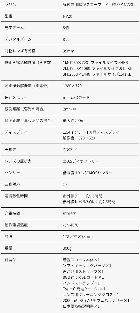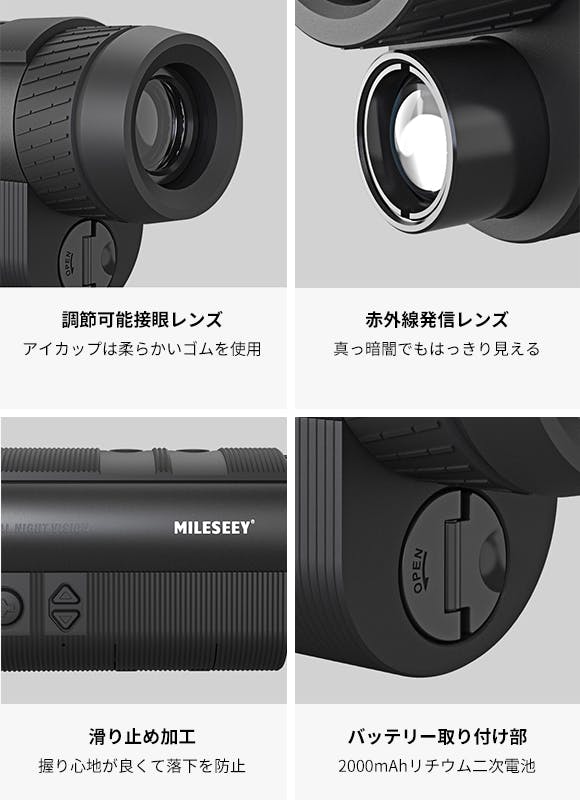 「MILESEEY NV20」は昼夜兼用の単眼鏡・暗視スコープ一体型の望遠装置です。自分が見ている景色をワンタッチで写真やビデオとして保存できます。赤外線機能も搭載し、夜間でもはっきりと見えます。音声を録音することも可能です。