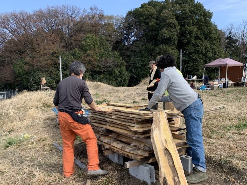 埼玉・東京・.千葉・神奈川から #縄文うるしパーク に集まったボランティアの皆さんと一緒に、先日製材したウルシ木材を桟積みしました。