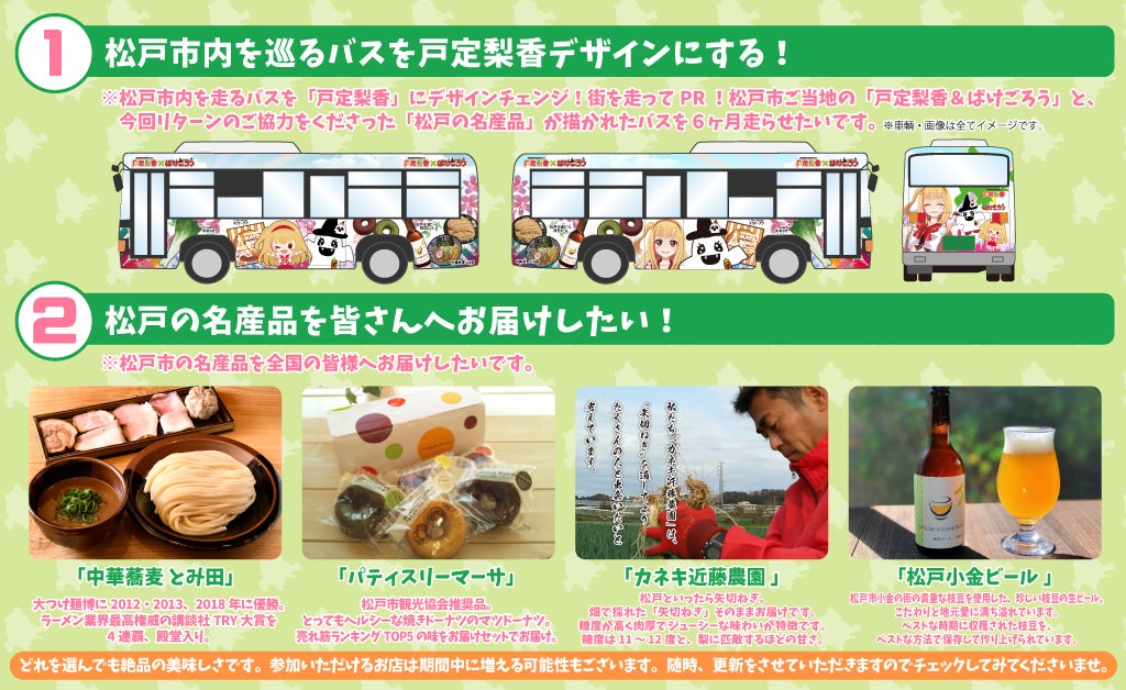 リターンで全国の皆様へ戸定梨香CF限定グッズや、松戸の美味しい名産品をお届け!