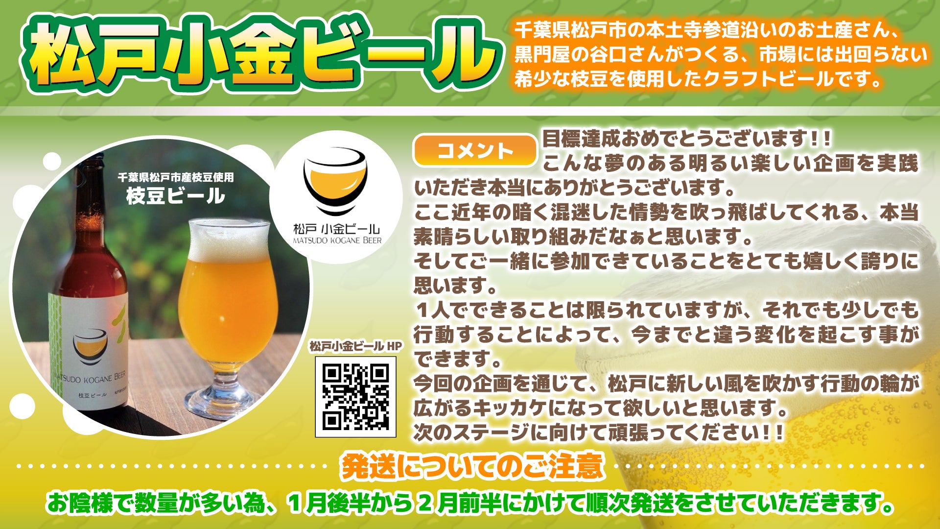 現在、170件以上のお申し込みをいただいております松戸小金ビール様より
