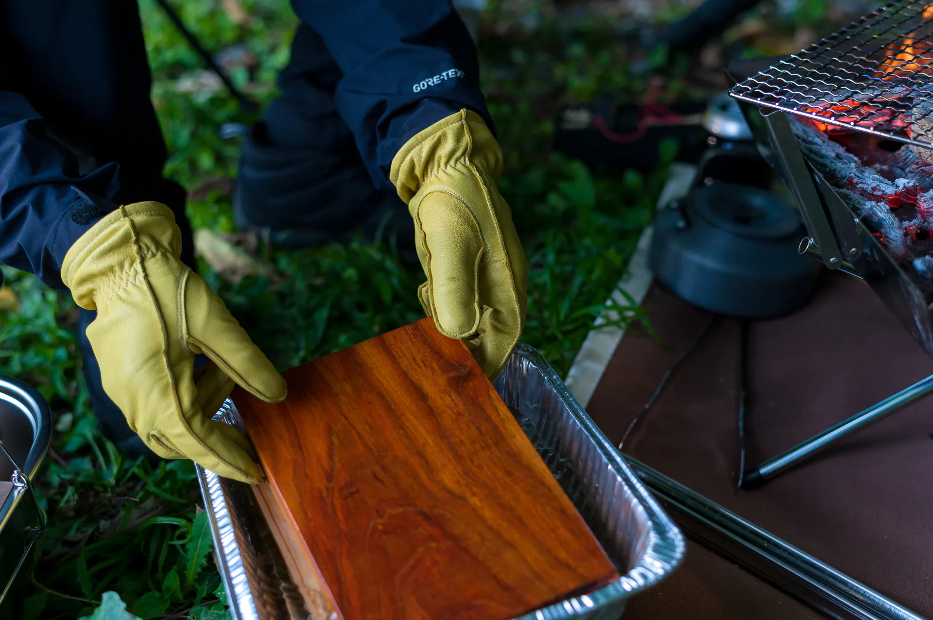 今回BBQの本場アメリカではスタンダードな木の上で焼く「ウッドプランクグリル」を行う際に、水に木を浸す作業があるのですが、グローブを着けたままでも安心して楽しめます。