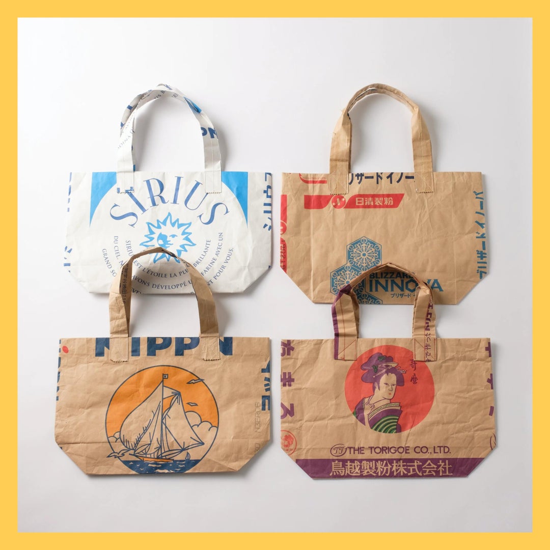 使用済みの小麦粉袋をアップサイクルした食パン1本入るサイズのエコ粉袋バッグ。