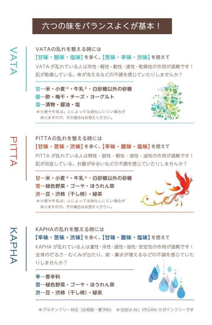 PEACE TABLEでは、その乱れを調べるための《ドーシャチェックリスト(問診票)》を使い、その結果をもとにアドバイス、そしてメニュー提案をします。