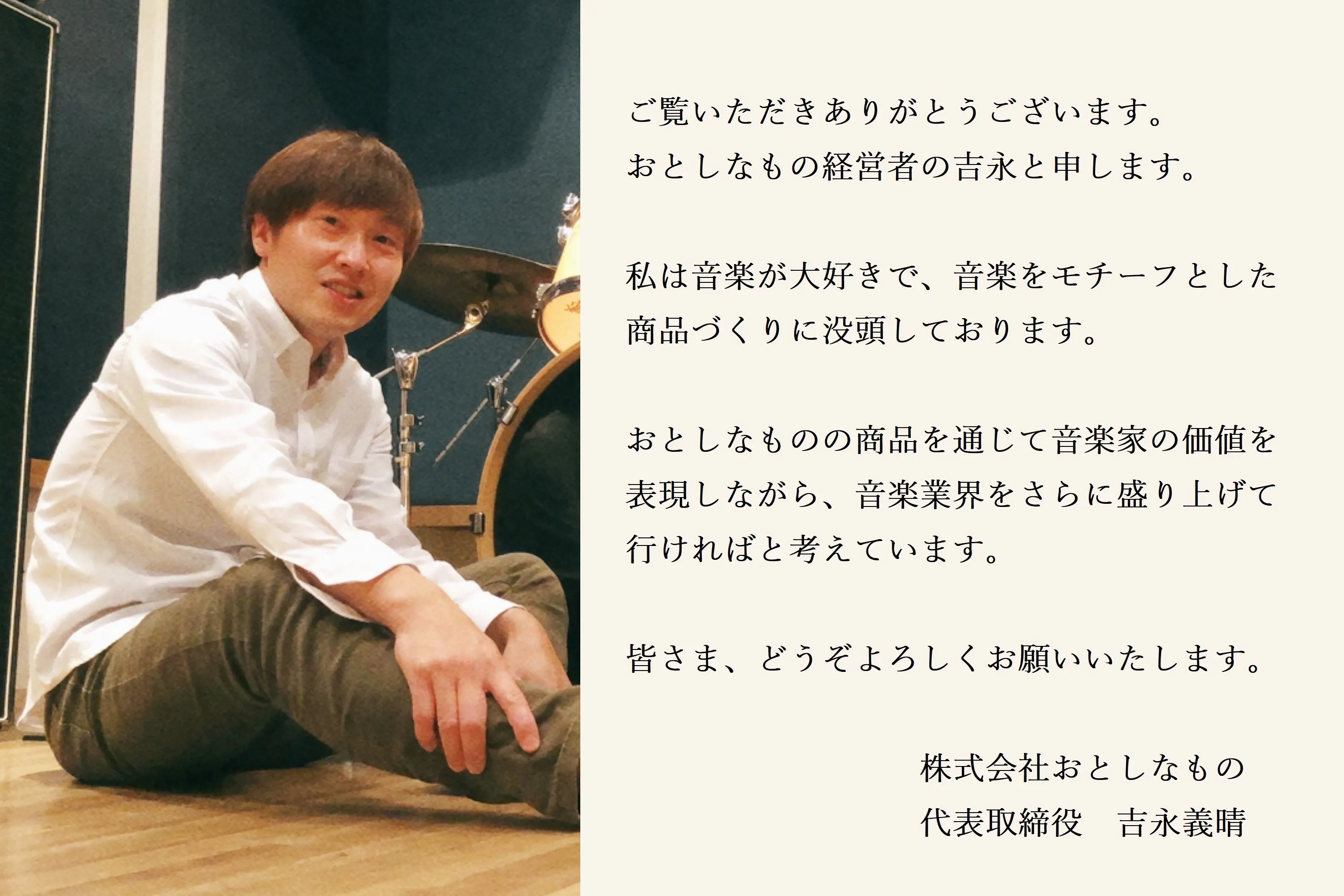 初めまして。株式会社おとしなもの代表取締役の吉永と申します。おとしなものは、音楽をモチーフとしたファッションを製作しているブランドです。