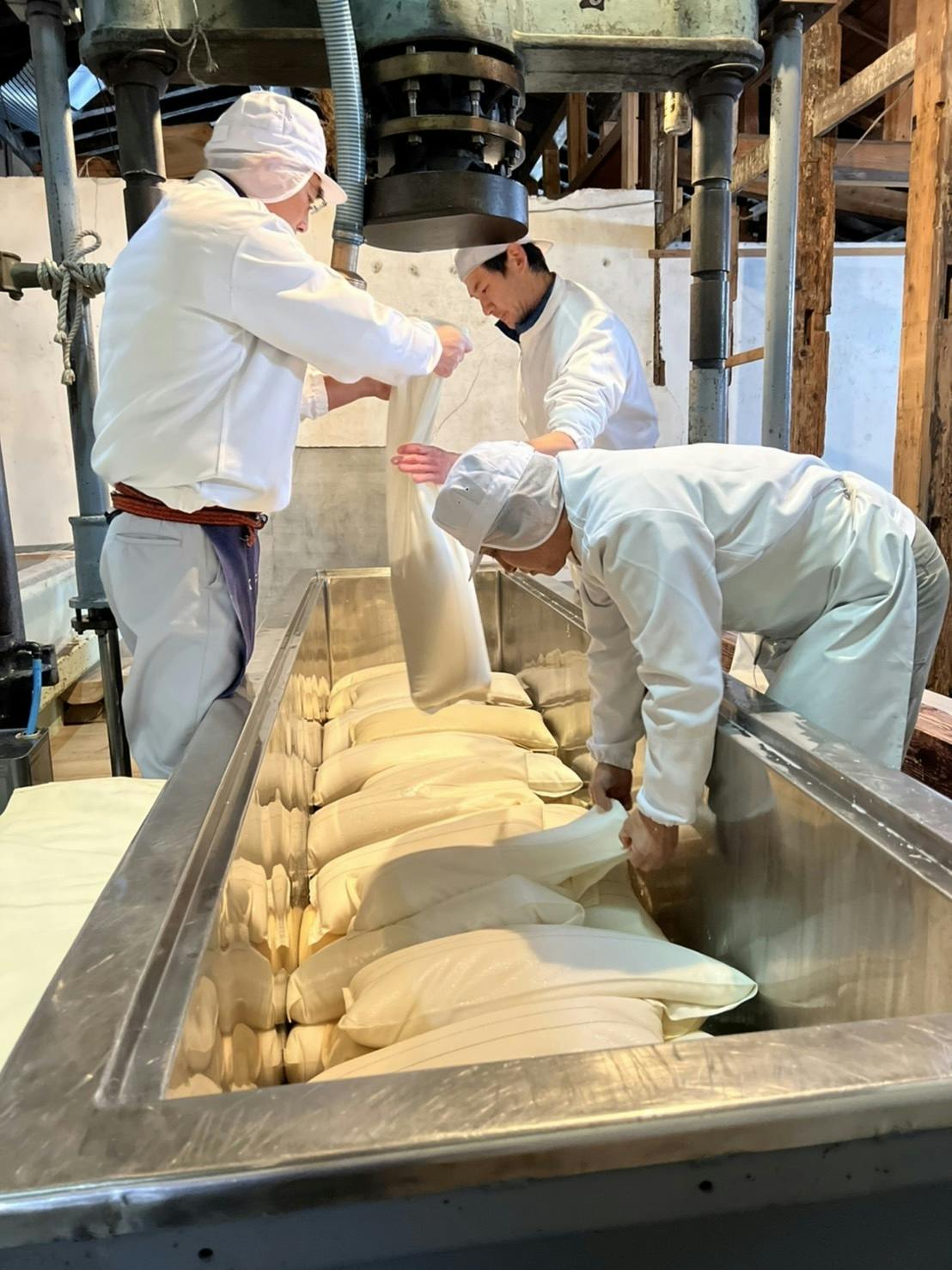 弊社の絞りは槽搾り(ふねしぼり)方式と呼ばれるもので、もろみを袋に入れて一つずつ槽に重ねて並べていきます。凍えるように冷たく重たいもろみの袋を腰をかがめながら並べいく工程は、若さを問わず骨の折れる作業ですが、学生さんたちが熱量高く取り組む姿は、頼もしい限りでした。