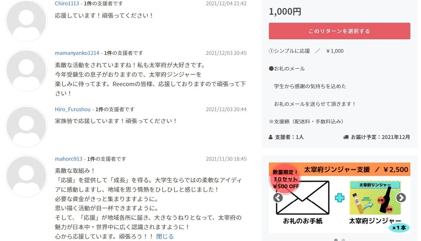 【ご報告!】クラウドファンディング目標金額達成したしました!!皆さま本当にありがとうございます!多くの方が、今回の取り組みにご理解いただき、支援してくださったことでこれだけの支援が集まりました!達成できるか不安でしたが、小さな応援の連鎖が広がり、大きな成果をもたらしました。これで、頑張っている人に太宰府ジンジャー届けることができます。そしてもっと多くの人を応援することができます!まだまだ応援の連鎖を広めたいと思います!!!引き続き頑張っていきたいと思います!皆さんも頑張って下さい!今後もこちらに活動報告を載せていきますので、ご支援いただいた方々に応援の連鎖が広まる過程を見守って頂きたいと思います!本当にありがとうございました。ReeCom一同