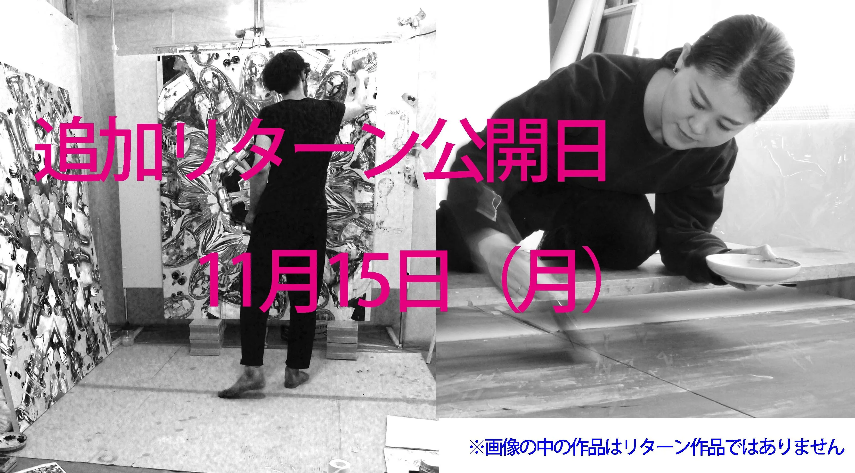 当初11月1日を予定日としてご案内しておりましたギャラリー運営担当者兼アーティスト、八嶋洋平・山浦めぐみの描き下ろし作品のリターン追加日程につきまして、『11月15日(月)』に変更させていただくことといたしました。