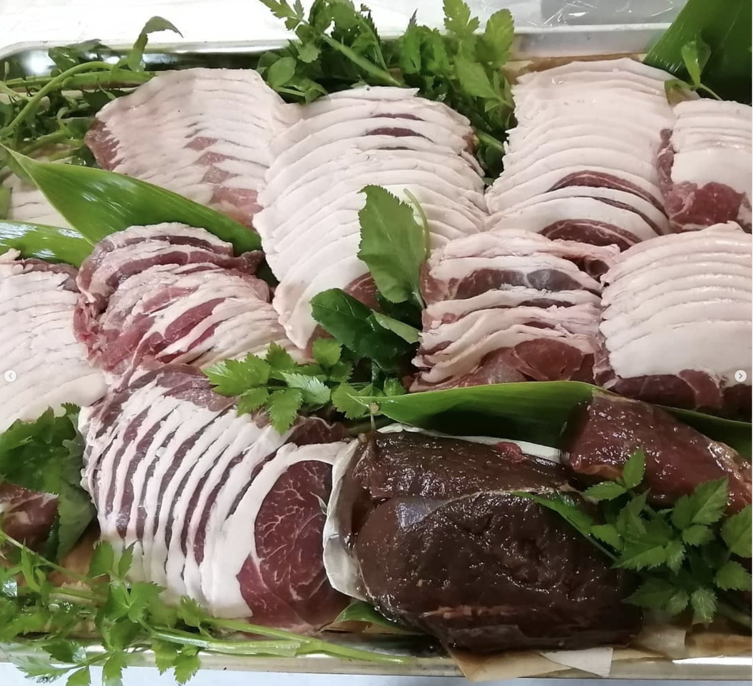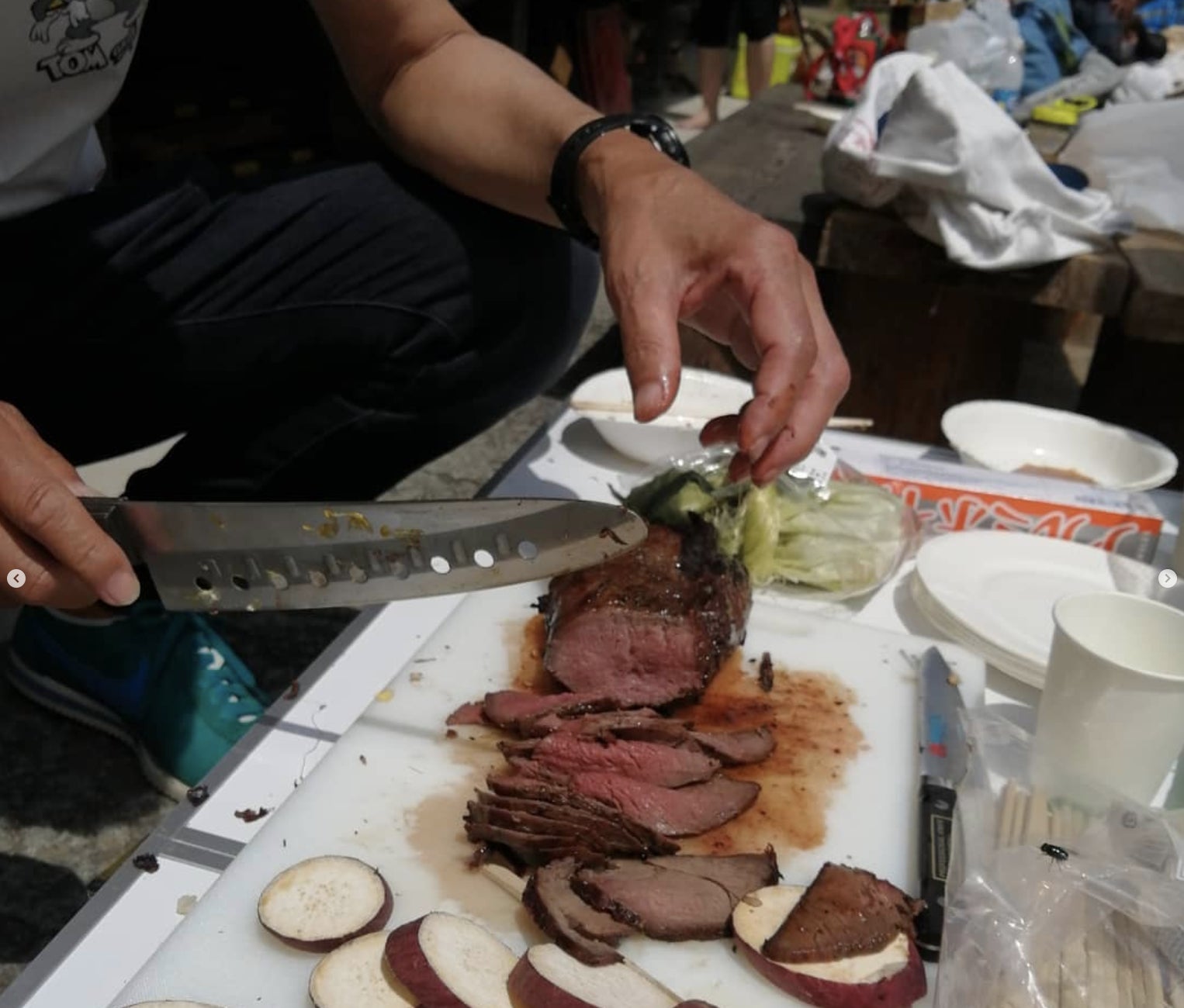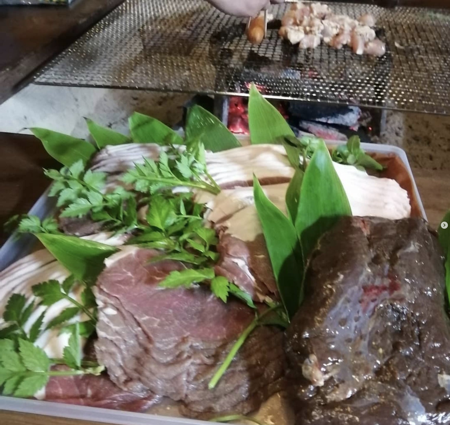 鹿肉はブロックで、猪はスライスで、BBQします。