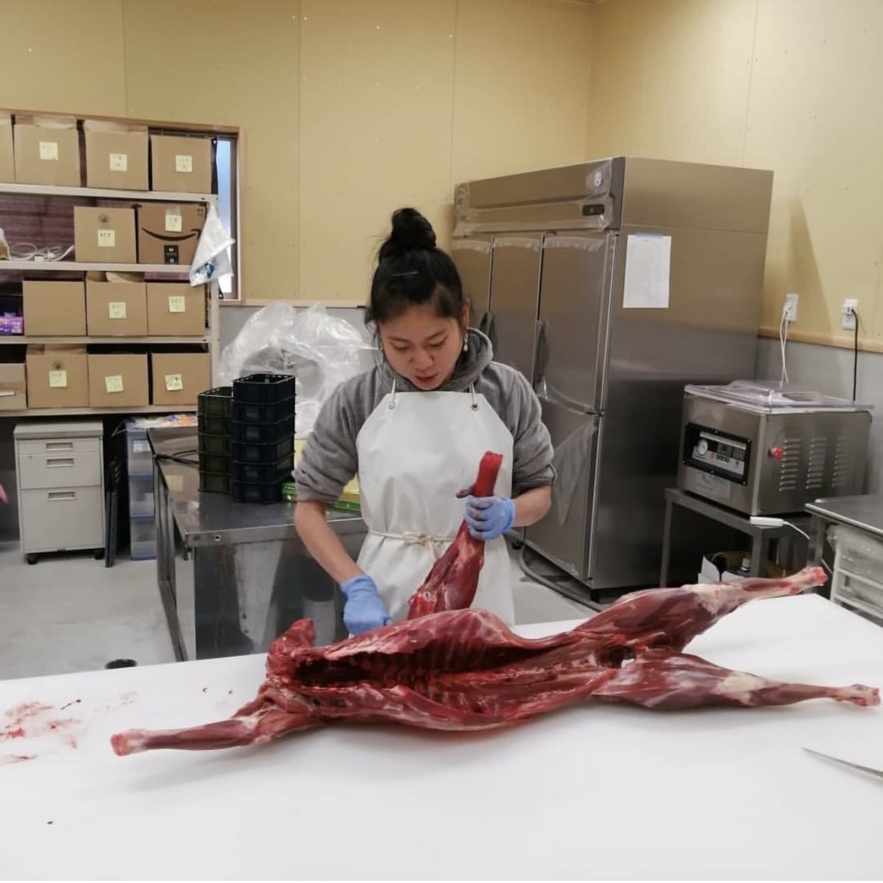 猪精肉&鹿肉スライス作業の様子です。