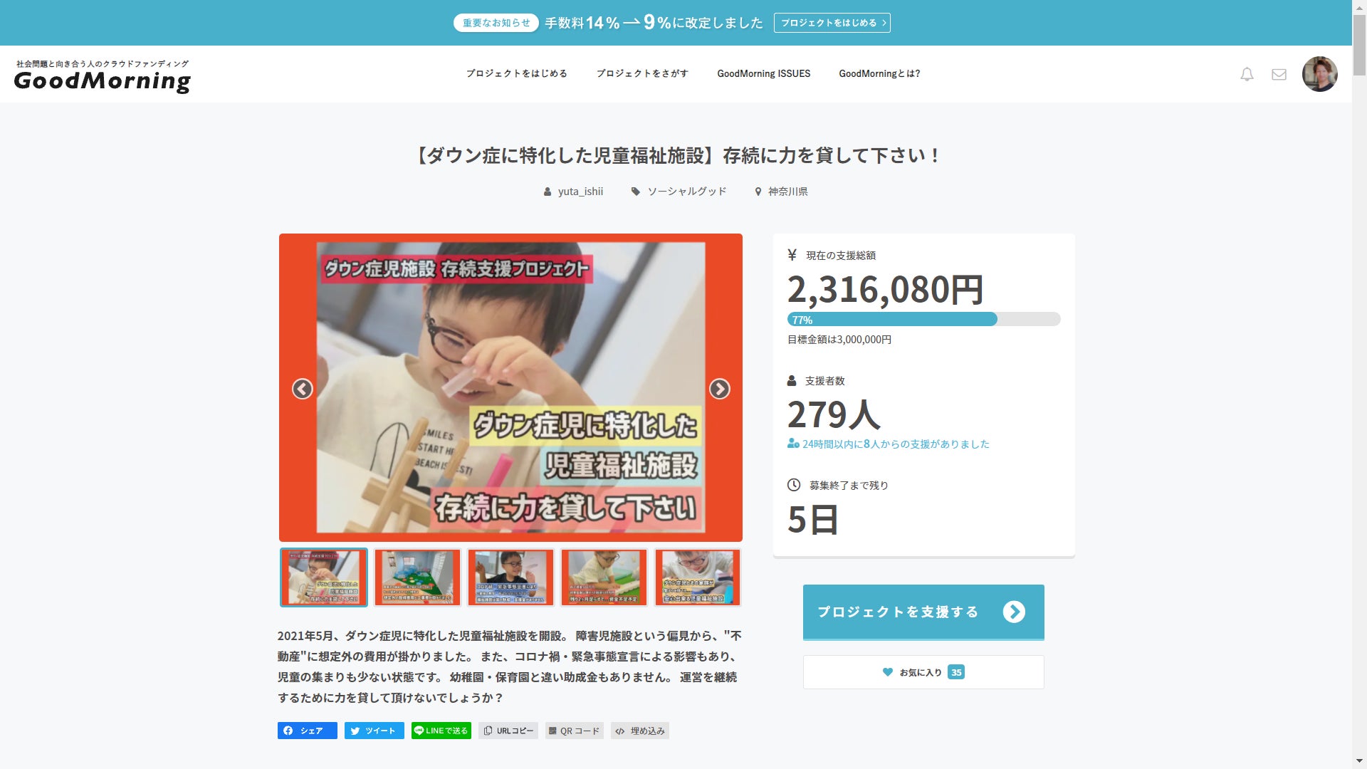 こんばんは。達成まで【残り69万円】となりました。沢山のご支援を頂きご支援の物資や沢山のメッセージ、プロジェクトのシェアもして頂き本当に本当にありがとうございます。嬉しすぎる気持ちでいっぱいです。想いを形にしたくて始めた事業所ですがお陰様で沢山の支援・応援を頂き、継続する事が出来ております。先ずは10/30までの目標が300万円。そして頂いたご支援を、しっかりと形にする事が最大の目標です。黒字化へのプロセスを考え、実行して運営を軌道に乗せる事で最初の恩返しをしていきたいと思っております。その後は、同様の事業を広げたり、本プロジェクトで繋がった様々な方と一緒に出来る限りの福祉事業を実現していきたいと考えております。将来の事など、時期尚早かとは思いますが、多くのご支援・応援が本当に力になります。残り5日、ご支援頂きました皆様も今一度、シェア・拡散にもう一度ご協力の程、お願い致します。どうぞ、宜しくお願い致します。
