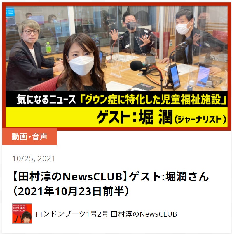 プロジェクト▶▶【残り5日・64万円】本プロジェクトがラジオ文化放送「田村淳のNewsCLUB」にてゲストの堀潤さんとロンブーの田村淳さん、弁護士の正木裕美、文化放送アナウンサー砂山圭大郎ににじいろの話を取り上げて頂けました。堀潤さんに、とても分かり易くお話頂けた事本当に感謝しかありません。堀さん、淳さん、正木さん、砂山さん、関係者の皆様本プロジェクトを取り上げて下さり、本当にありがとうございました。皆さま、是非ご視聴頂ければと思います。引続き、ご支援・応援・シェアを、お願い致します。