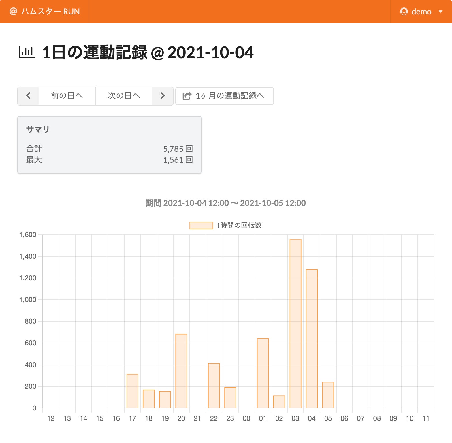 ※ 以下は開発メンバーの飼っているハムスター(名前は「ホネ」)の実際の運動記録データを「Hamster Run アプリ」から確認した画像です。