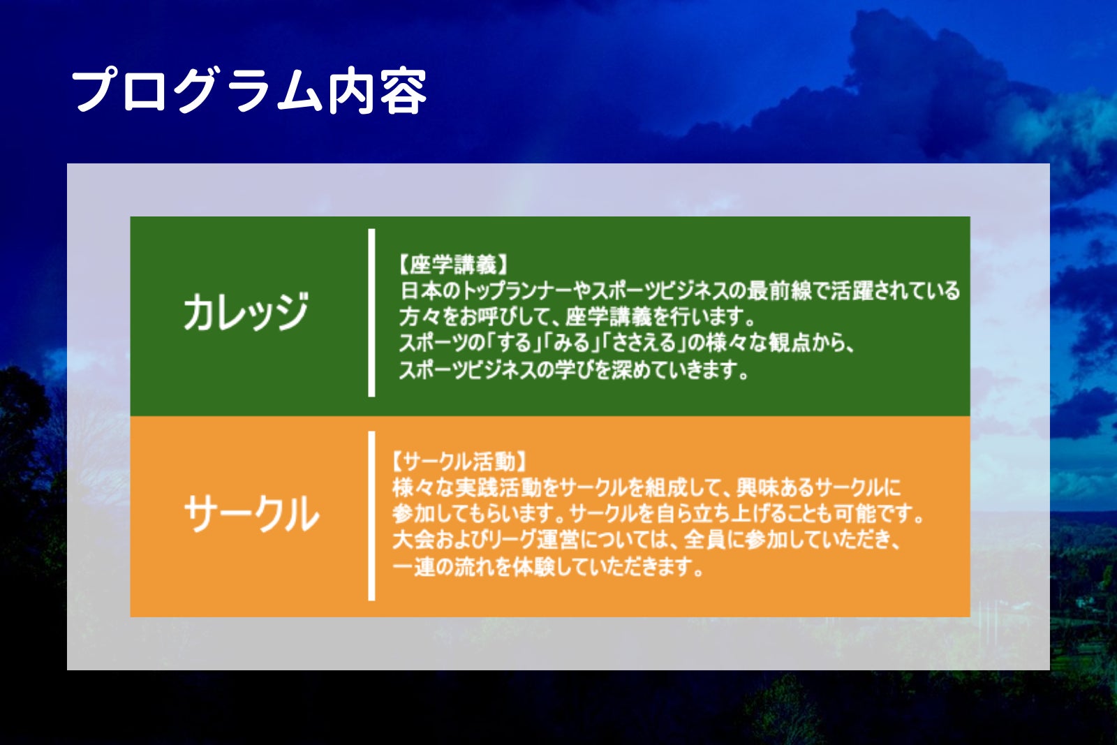カレッジについては、eスポーツだけでなく、様々な競技に携わっている方をお呼びし、「する」「みる」「支える」など多角的な観点から講義していただきます。上記の目標に、「eスポーツの大会、リーグの創設」とありますが、サークル活動の一環として、ワーキンググループを作成し、eスポーツにお取り組みされている企業のご担当者さまにご協力いただき、メンバーで対話を繰り返しながら、大会運営に向けて必要なことを進めていきます。そして、3月には実践機会として、大会をメンバーで運営します。運営に必要な資金獲得も当然ながら自分たちで営業して獲得をしていきます。それ以外にも実践の機会やスポーツ最前線の現場の見学などの学びの場を提供します。