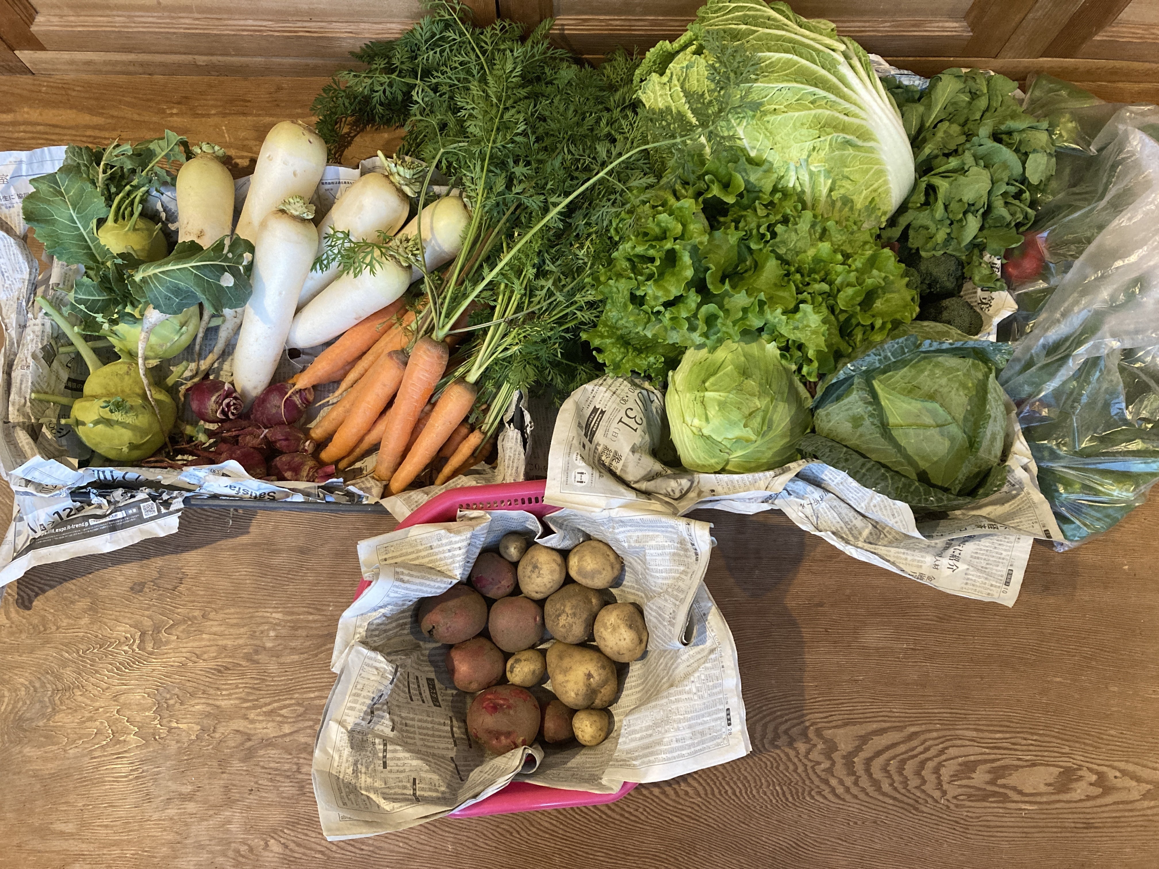 2021/12/03 15:35秋に植えた冬のお野菜が採れはじめました。写真にあるお野菜は、白菜、キャベツ、春菊、サラダ菜、ブロッコリーニンジン、大根、グランドデューク、アンデスレッド、にしゆたかピーマンです。グランドデュークは、カブのような形ですが、カブのような根菜ではなく、茎からブロッコリーのような感じの葉っぱが生える野菜で、茎の根本の部分を食べます。じゃがいもは、アンデスレッドと、にしゆたかができています。めずらしいお野菜も栽培していますので、リターンを楽しみにしていてください! もっと見る