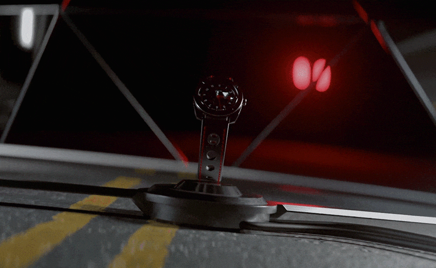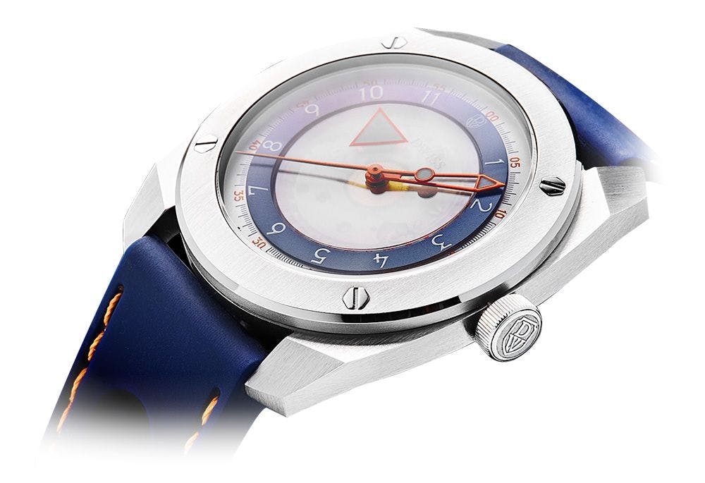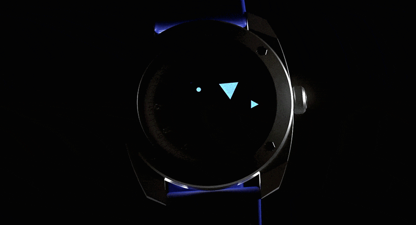 多層レイヤー構造のダイヤルにサファイアクリスタルを使うことで、三角時針が空中に浮いているような姿で時間を表してくれます