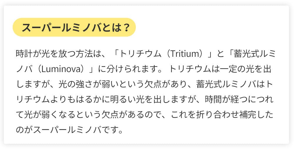 特にR2に使用されたBG-W9はスーパールミノバの中で2番目に強力な光であり、他のルミノバと違って基本は白色で夜光は青色なので高い選好度を示し、高級時計でよく使用されています。