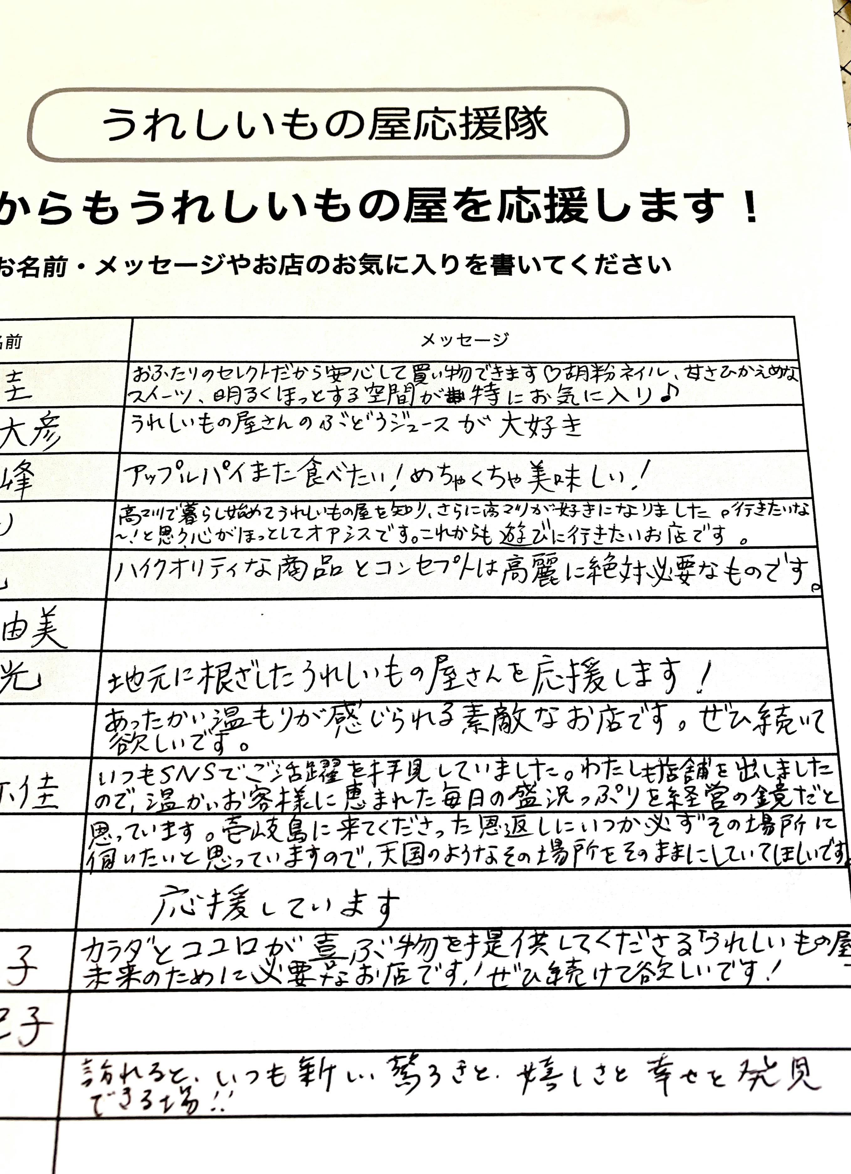 どこまで効力があるかわからないが、5月に「うれしいもの屋応援隊」としてお客様や、お取引先様などにお願いしたところ、