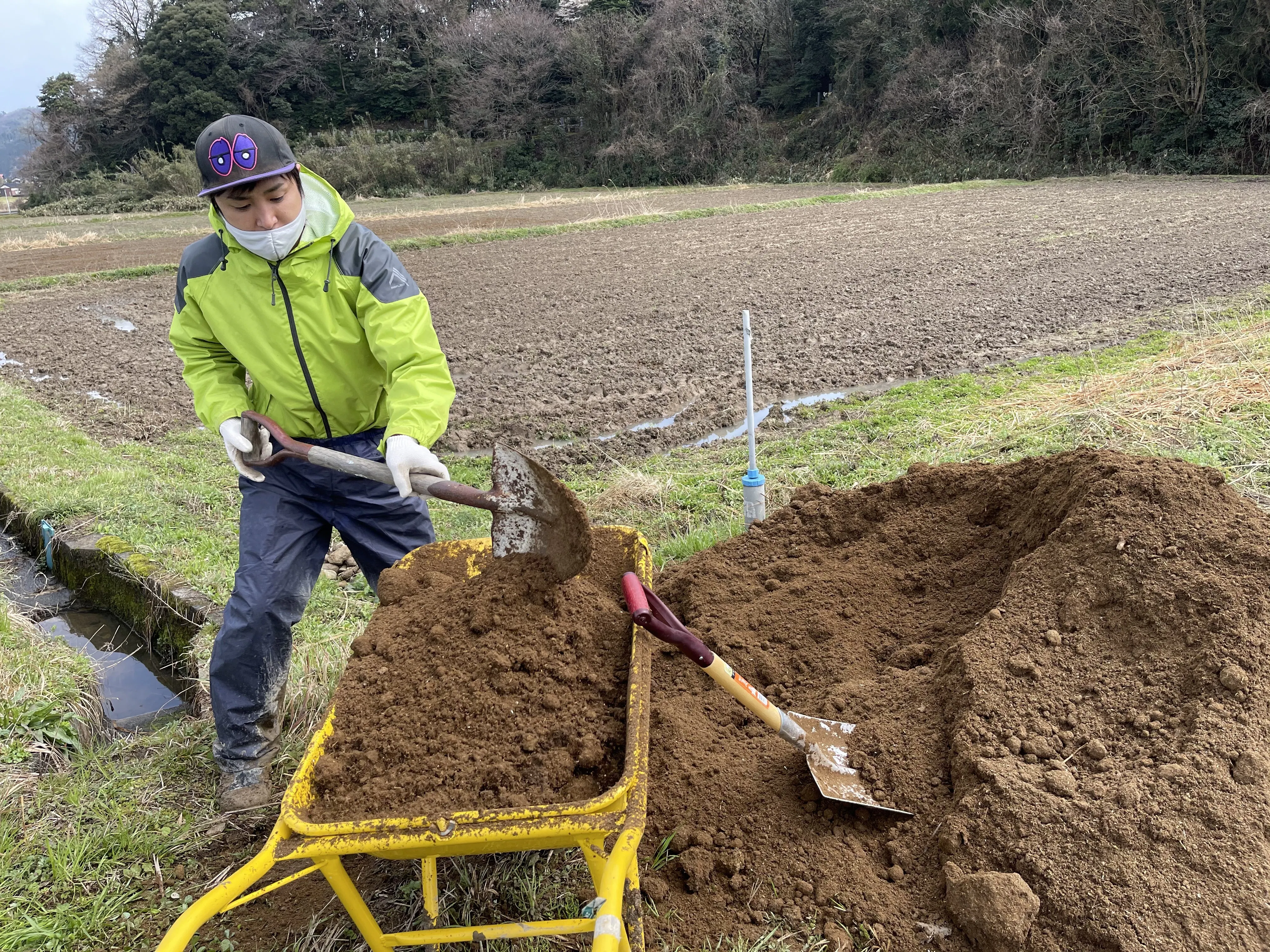 大きくて、栄養価の高い生姜をつくるための土づくり。牛糞堆肥を入れました。(3月)