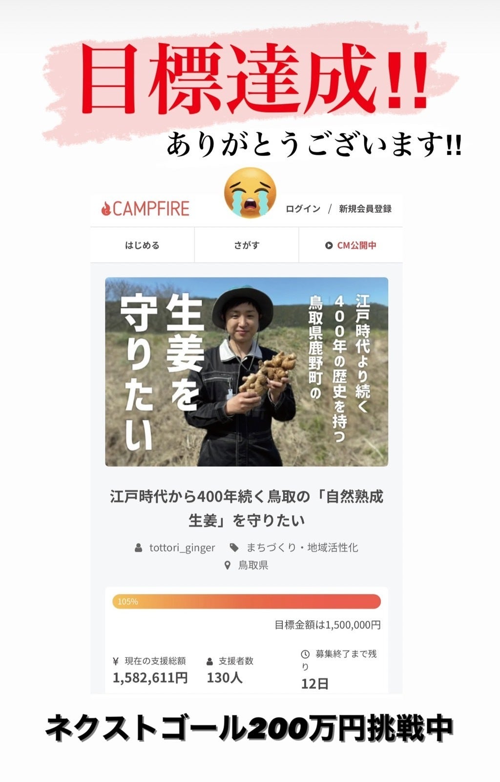 2021/11/18 17:30皆様 こんにちは。本企画発起人、三宅 大地です。このプロジェクトの目標である150万を達成いたしました。本当にありがたい限りでございます。現在収穫作業を終え、生姜の加工品生産準備に勤しんでいるところでございます。 作業過程は多少の想定外のことはあれでも、順調といえる作業進行だと思います。予定通り12月初旬より随時リターン商品を発送していける予定がたっております。また現在ネクストゴール200万円に向けて新たな挑戦中でございます!引き続き温かいご支援よろしくお願いいたします。ここまでご支援頂いた皆様本当にありがとうございました!掲載終了後、改めて個人的にもお礼のメッセージをお届けさせて頂きます^-^ もっと見る