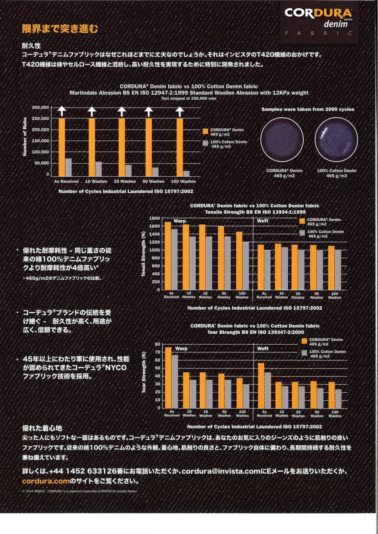 従来の綿100%デニム生地よりも耐摩耗性が4倍強い【コーデュラデニムファブリック】
