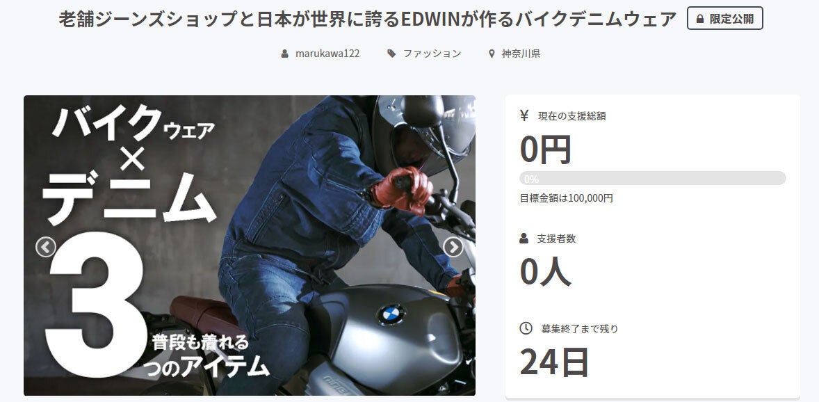 いつも応援ありがとうございます。【マルカワ×EDWIN/最強のジーンズ】プロジェクト担当の神原です。お待たせいたしました!!【老舗ジーンズショップと日本が世界に誇るEDWINが作る3つのバイクデニムウェア】新プロジェクトページが公開となりました!!↓こちらもからいけます。私たちマルカワ湘南店と長年のパートナーカンパニーであるEDWIN社が、バイクに乗るときはもちろん、降りたときでもカッコよく着られるバイクウェアをデニムで作ってみました!しかも3つ!!!というプロジェクトです!!こちらも是非お気に入り登録とご支援をいただけますと嬉しいです。ぜひチェックしてみてください♪よろしくお願い致します!