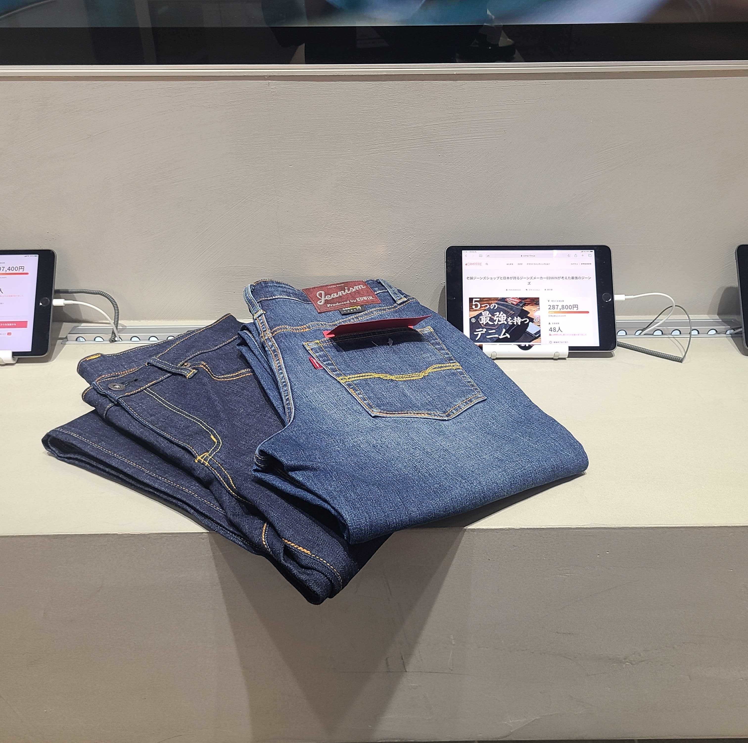 マルカワ×EDWIN【最強のジーンズ】プロジェクトページをご覧いただきありがとうございます!*******お知らせ*******今回のプロダクト【Jeanism Produced by EDWIN/最強のジーンズ】がCAMPFIREで公開中のいろいろなプロダクトが展示されているCAMPFIRE ブースタースタジオ(渋谷PARCO内)という展示ブースにて 期間限定で展示されることになりました!!(12/12のプロジェクト終了日まで)******************展示キタァーーー♪ありがとうございます!!実際に見てみたい、色、素材、肌触りを確認したい!本当に伸びるの?補強ステッチって何?ポケット2重ってどういうこと?などなど。興味を持っていただいた方には朗報です。実際にお手に取って確認できるチャンスですので、是非渋谷パルコでチェックしてみてください!!渋谷パルコCAMPFIREブースタースタジオはコチラです。営業日や営業時間などはサイトをご確認ください。それでは、引き続きご支援よろしくお願い致します!