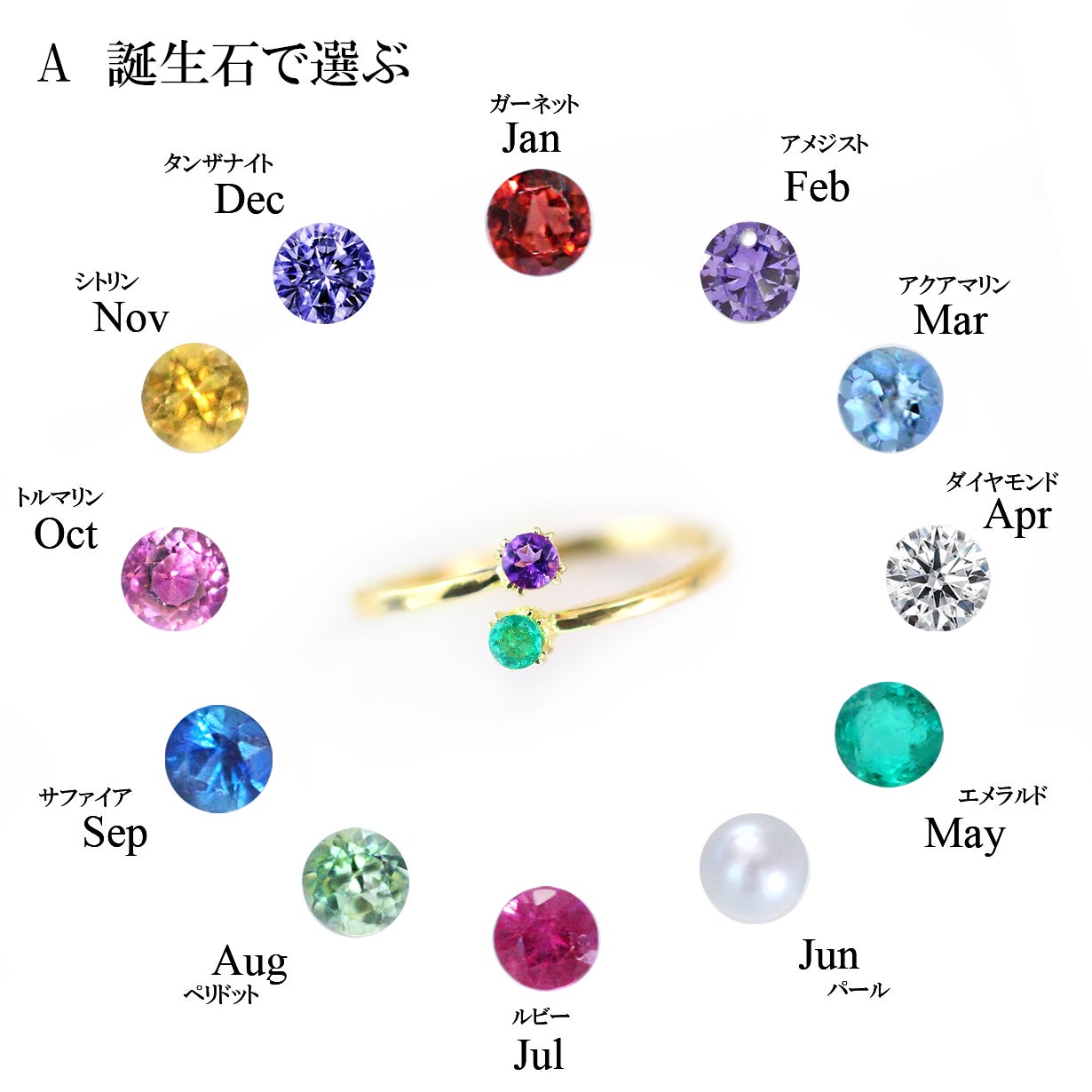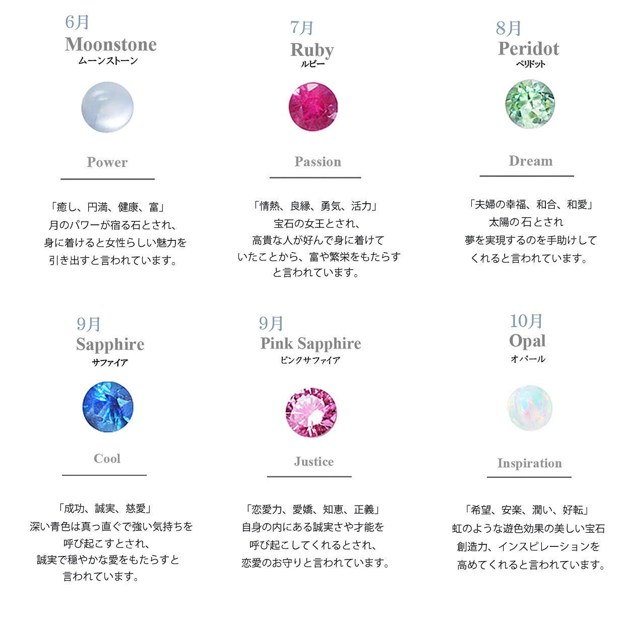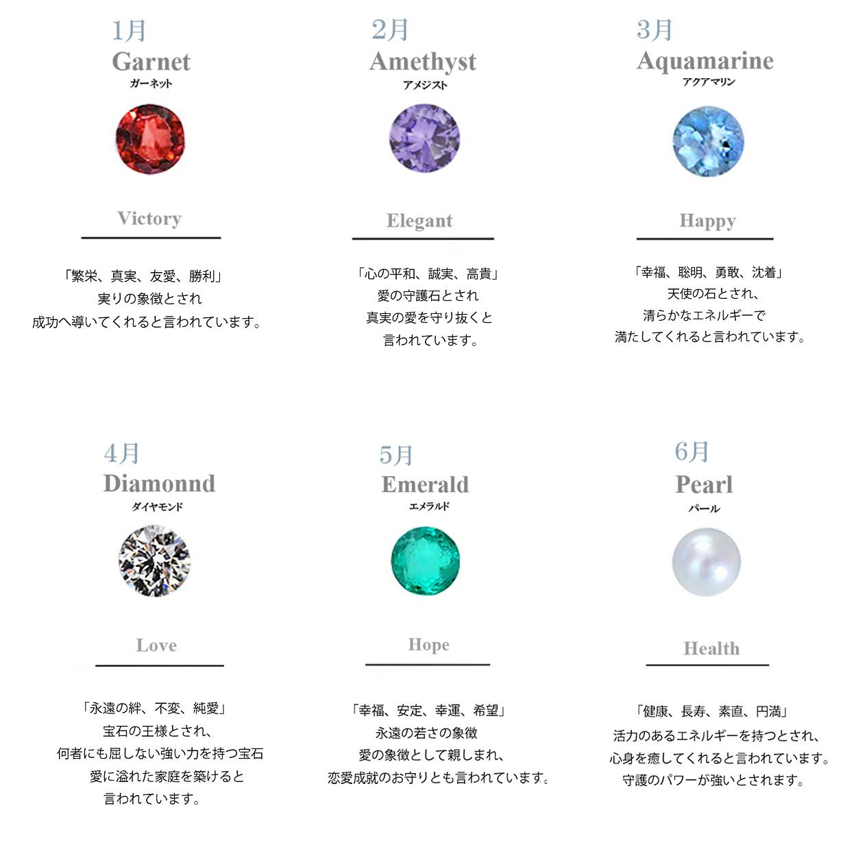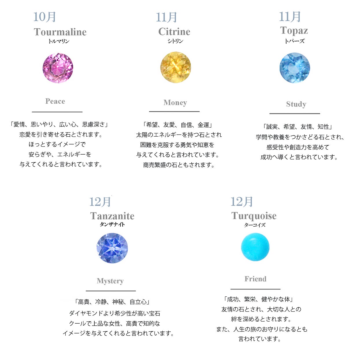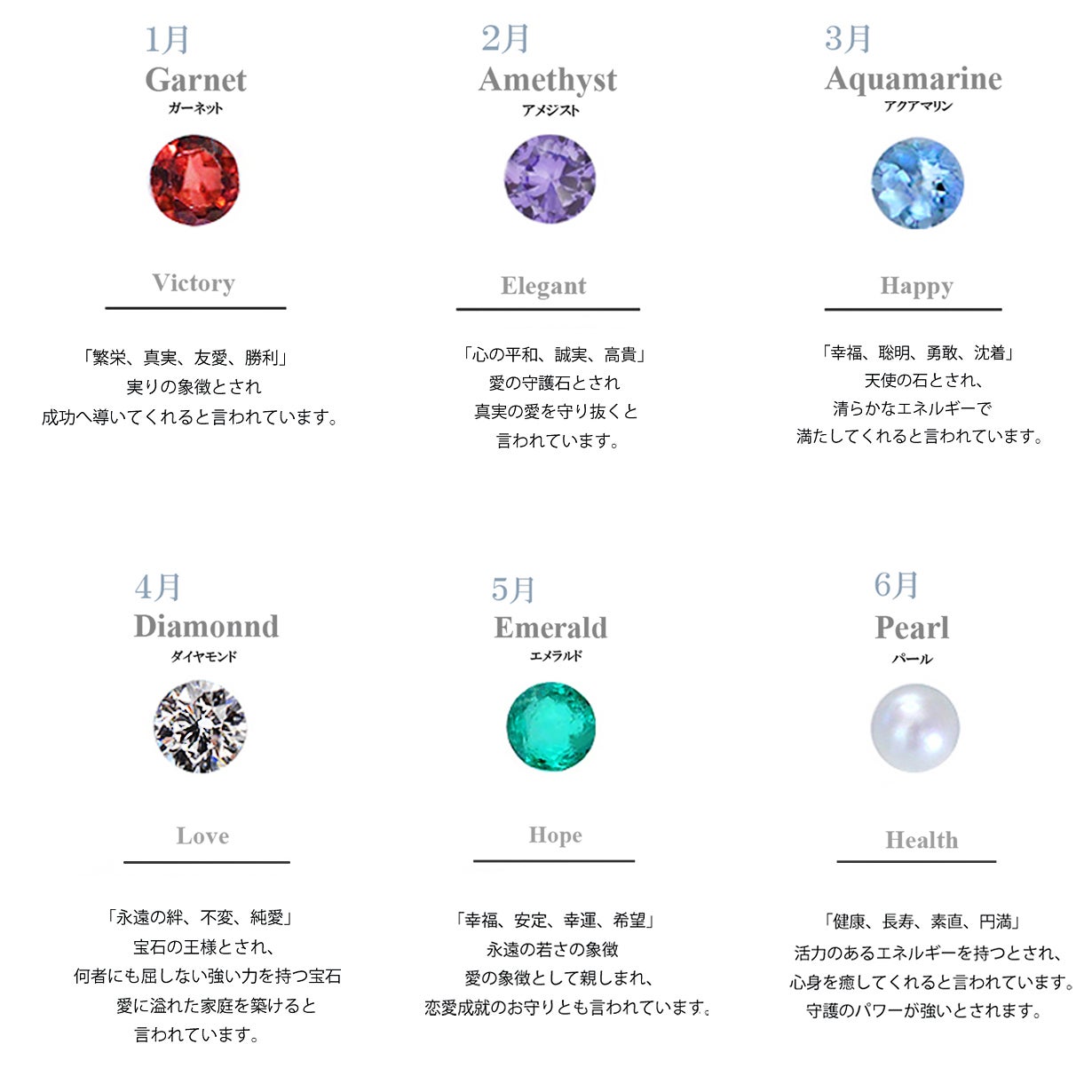 ガーネット、アメジスト、アクアマリン、ダイヤモンド、エメラルド、ムーンストーン、パール、ルビー、ペリドット、ブルーサファイア、ピンクサファイア、オパール、ピンクトルマリン、シトリン、ブルートパーズ、タンザナイト、ターコイズ