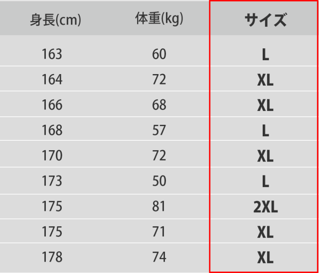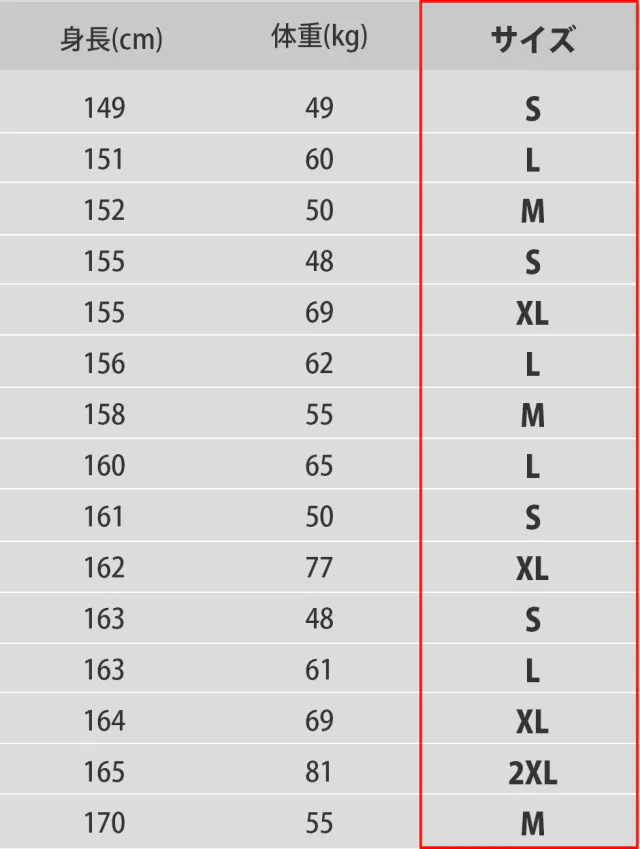 サイズは下記のリストを目安にお選び下さい。