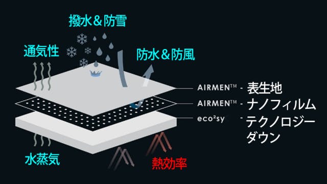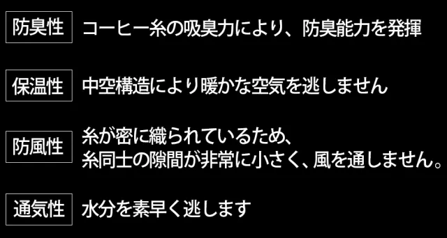 ペットボトルとコーヒーパウダーをリサイクルして作られたeco2sy生地は、防臭性・保温性・防風性・通気性に優れ、非常に軽い着心地を実感いただけます。