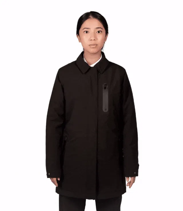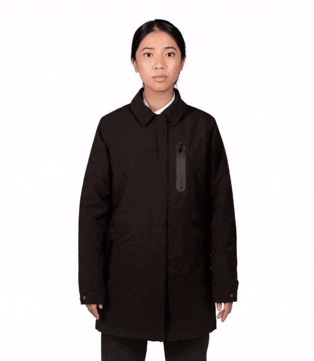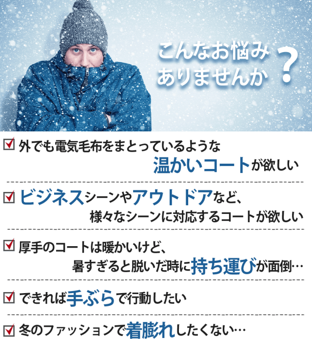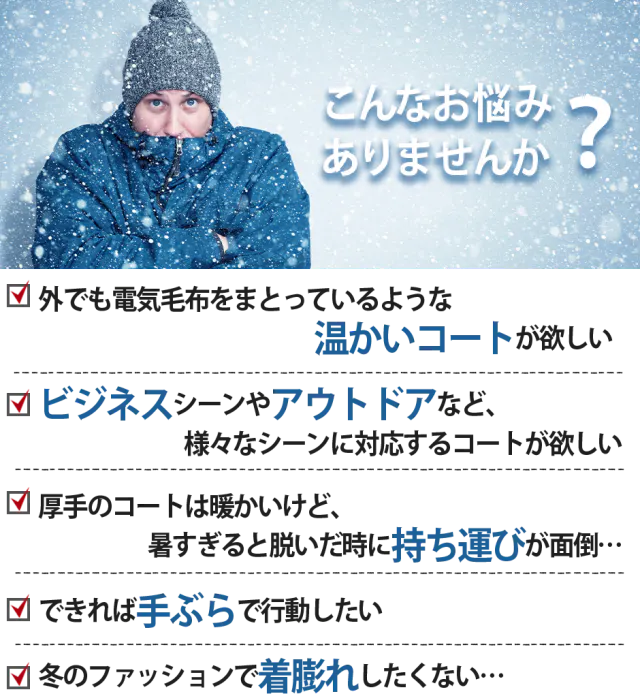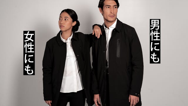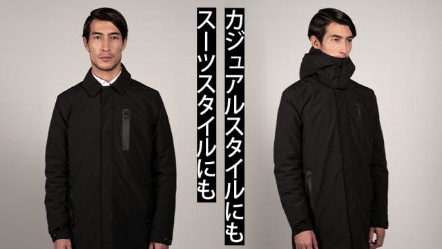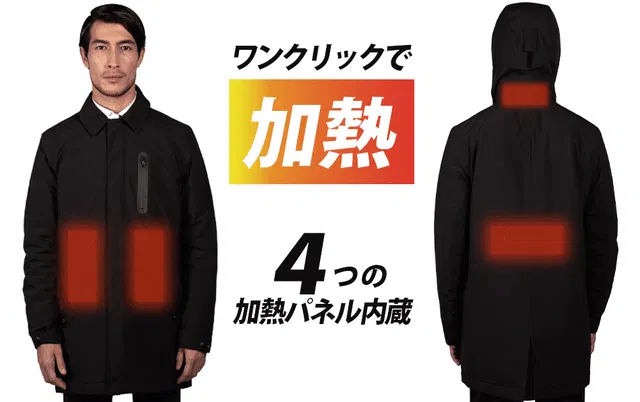 ボタンを押すだけで加熱する寒さに打ち勝つための電熱コート。フォーマルからアウトドアまで幅広く使えるデザインが魅力。