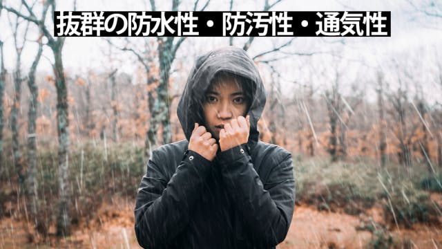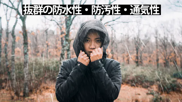 抜群の防水性・防汚性・通気性を持ちます。さらに防水加工ファスナーで水の侵入を完全ガード!