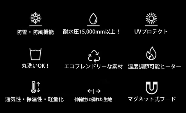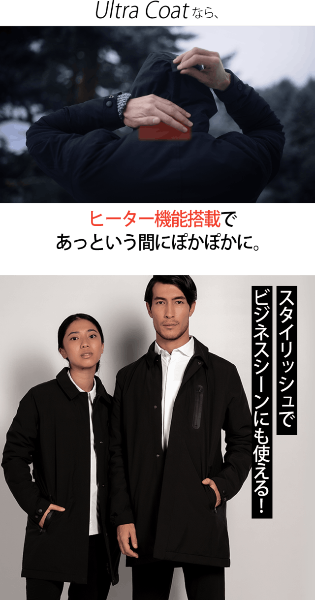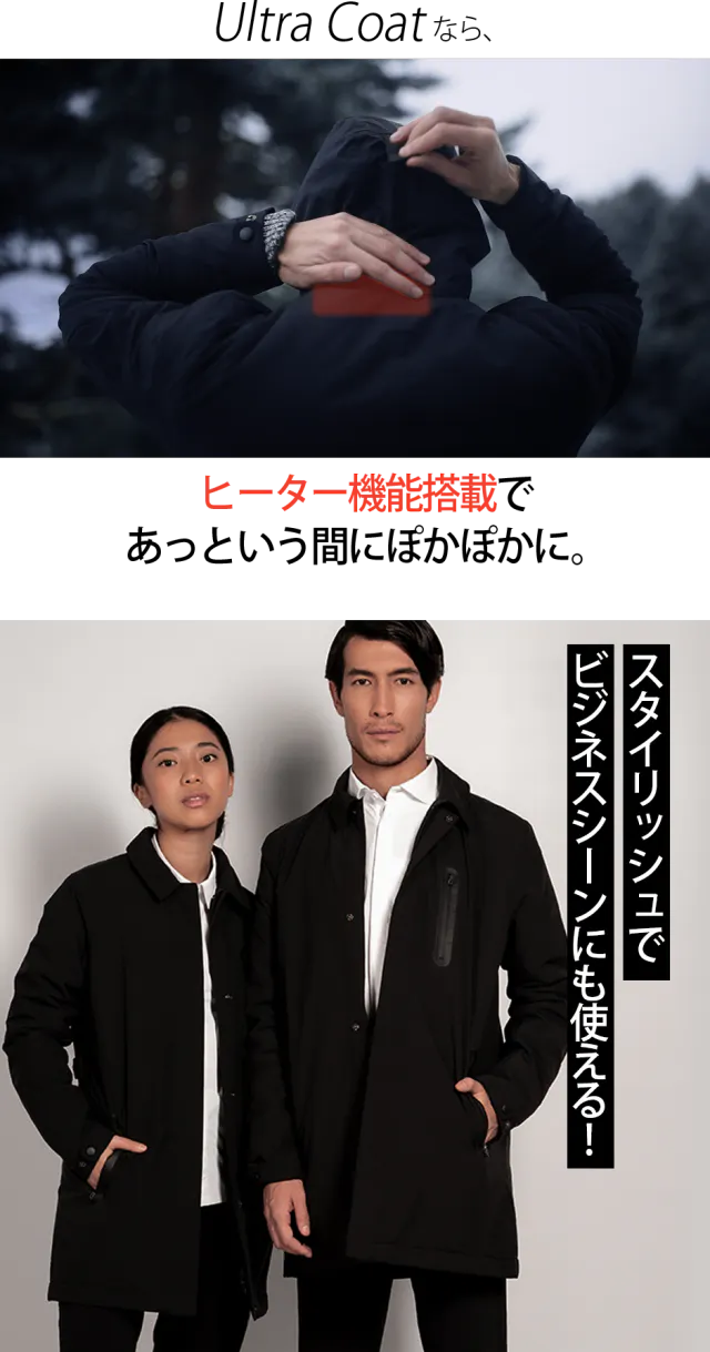 冬の寒さが厳しい日本には欠かせないヒーター機能を搭載し、防水・防風・防雪、さらにはUVプロテクション機能まで揃ったコートはまさにウルトラ級です!