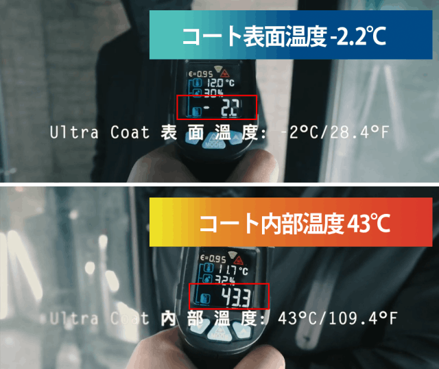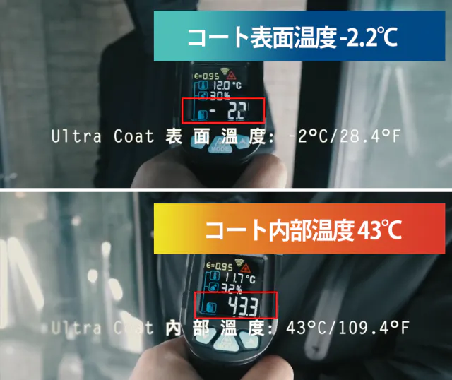 -2.2℃の実験室でも、コートの中は43℃とぽかぽか。