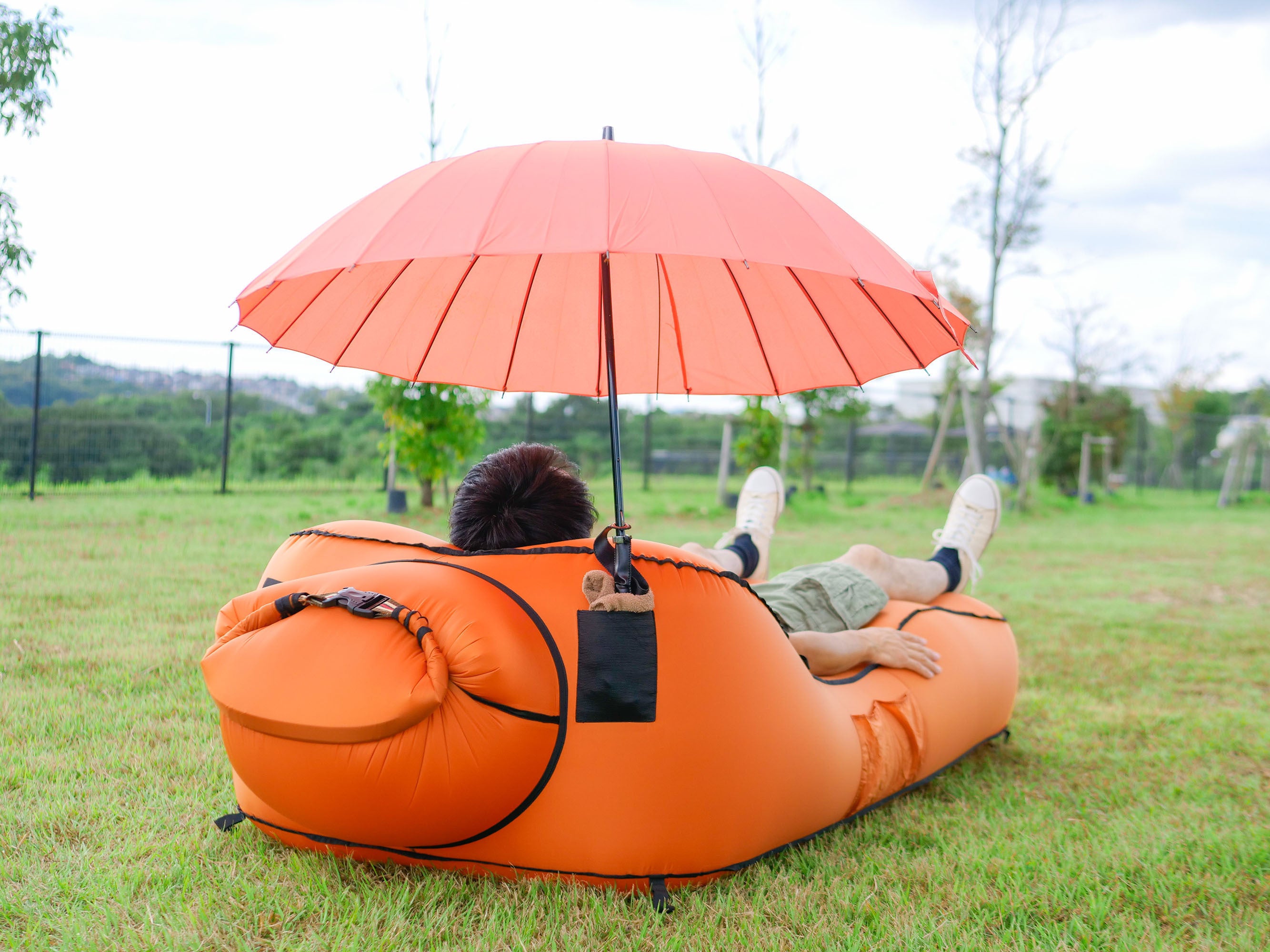 このエアーラウンジャーはパラシュート素材で出来ており、耐久性、通気性、強度、快適性が抜群です。ストレスや社会不安の多い現代において、皆様が自然の中で心身ともにリラックスして、友人やご家族との楽しく貴重な時間を過ごせる様、このエアーベッド商品を開発しております。