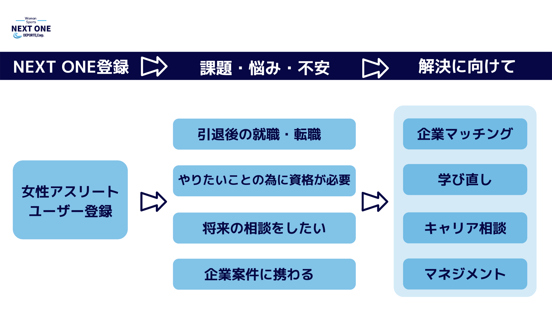 NEXT ONEでは女性アスリートのセカンドキャリアへの課題を中心に、すべての課題の解決をする為にプラットフォームという仕組みを構築することにいたしました。