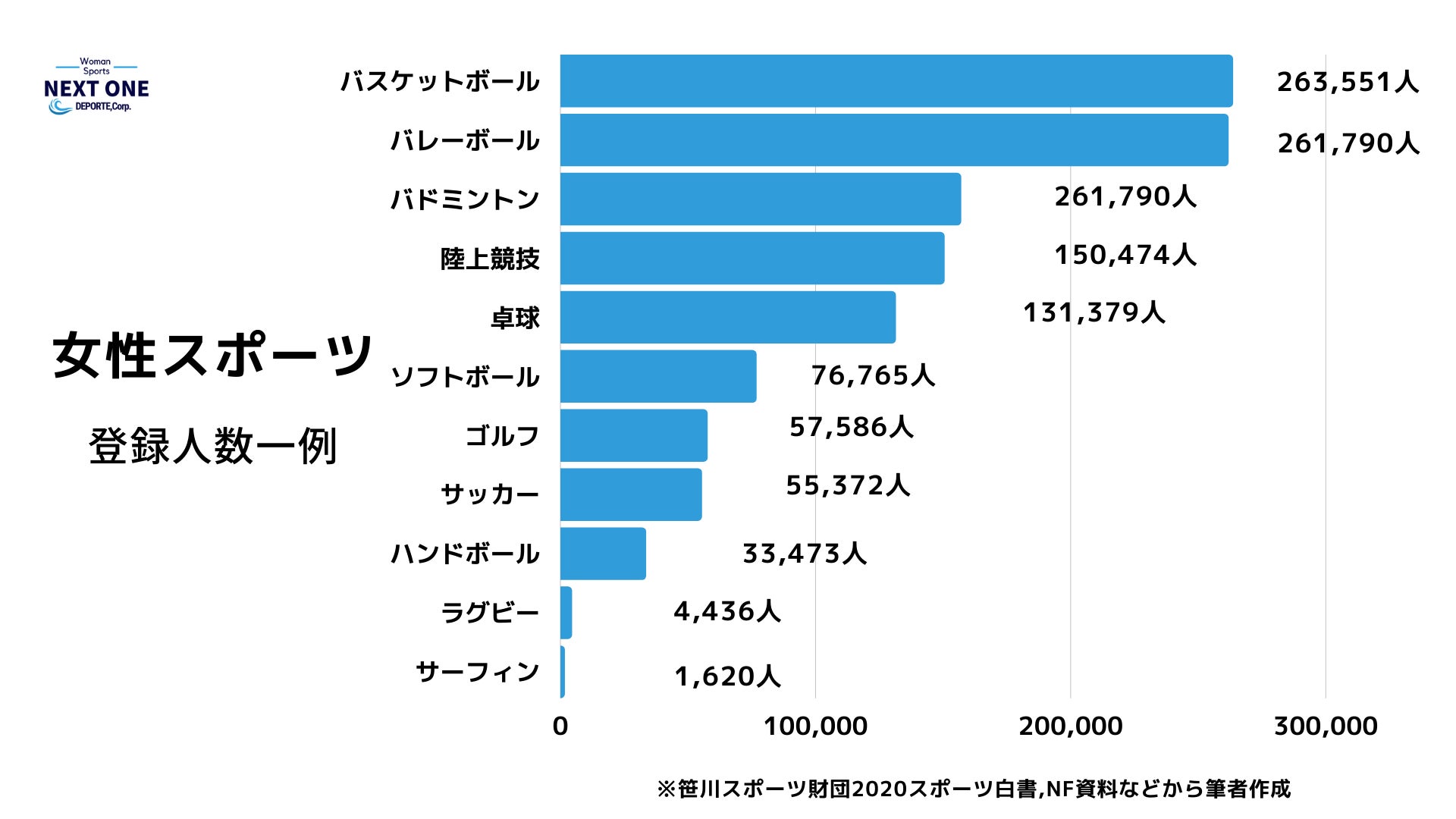 女性スポーツ登録者数は多く、特にバスケットボールとバレーボールは世界的に見ても多くの割合を占めていることがわかります。