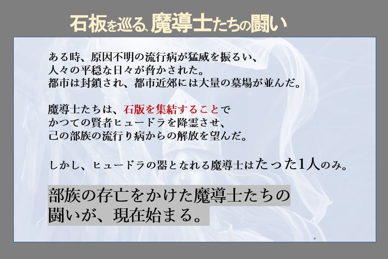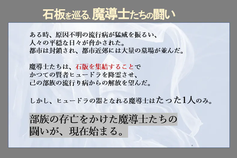 流行病が猛威を振う中、魔法の石板を巡って争いを繰り広げる魔道士たちの世界です。