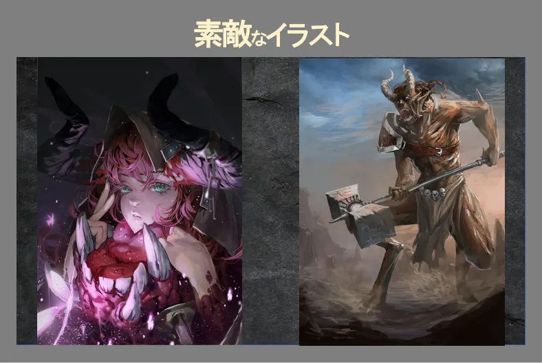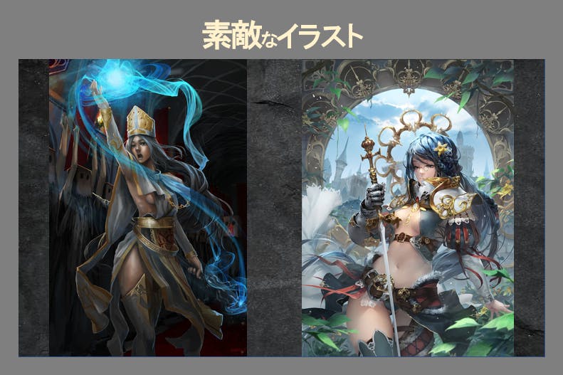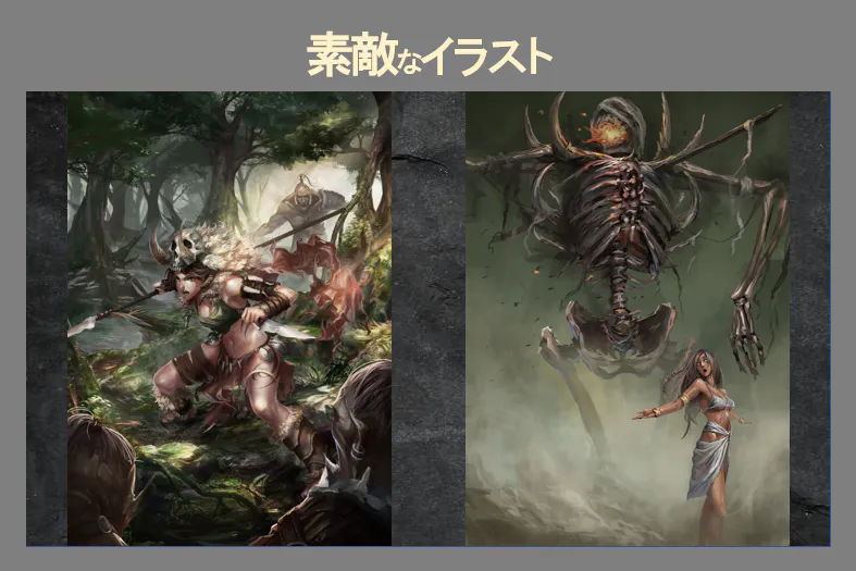 また、強化アイテムである魔導書カードの発動条件をより多く満たすように石版カードを組みかえていくことで、効果のコンボを生み出し、自身の強化を行えます。