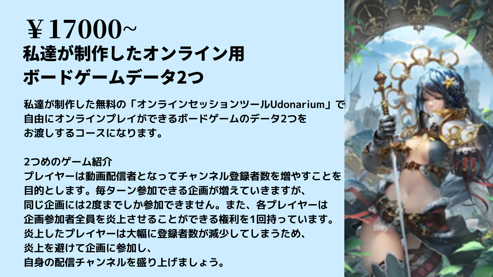 無料の「オンラインセッションツールUdonarium」上で自由にオンラインプレイができる私たちが制作したボードゲームデータ1つをお渡しするコースとなります。