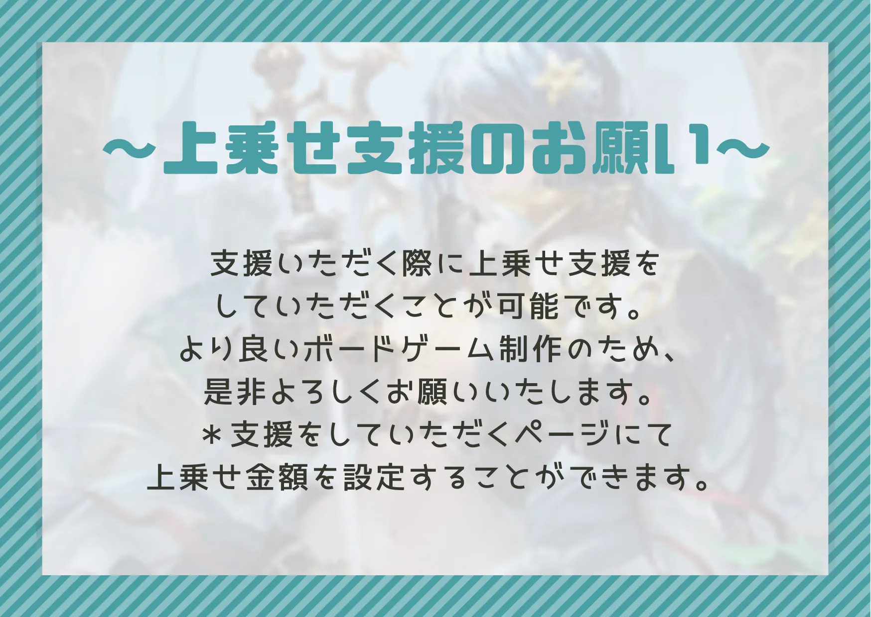 支援いただく際に上乗せ支援をしていただくことが可能です。より良いボードゲーム制作のために、是非よろしくお願いいたします。