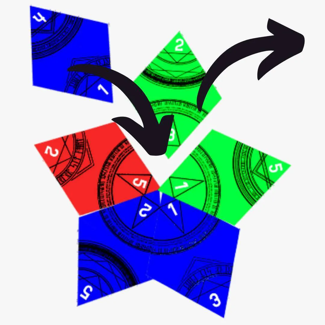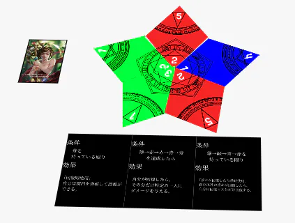 石版カードには色・柄・数字が異なる魔法陣が刻まれており、魔法陣の色ごとに特殊効果が存在します。好きな効果を下の写真のように星形に自由に組み合わせることで、行動や自分自身の強化を目指します。