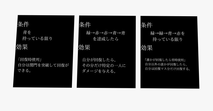 この行動の中で「自分が回復したら、特定の一人に回復分のダメージを与える」というような魔導書の効果や、「公開時に石版の種類に応じて、効果が変動する」というような役職カードの効果が複雑に絡み合うことで、戦況に変化が生じます。