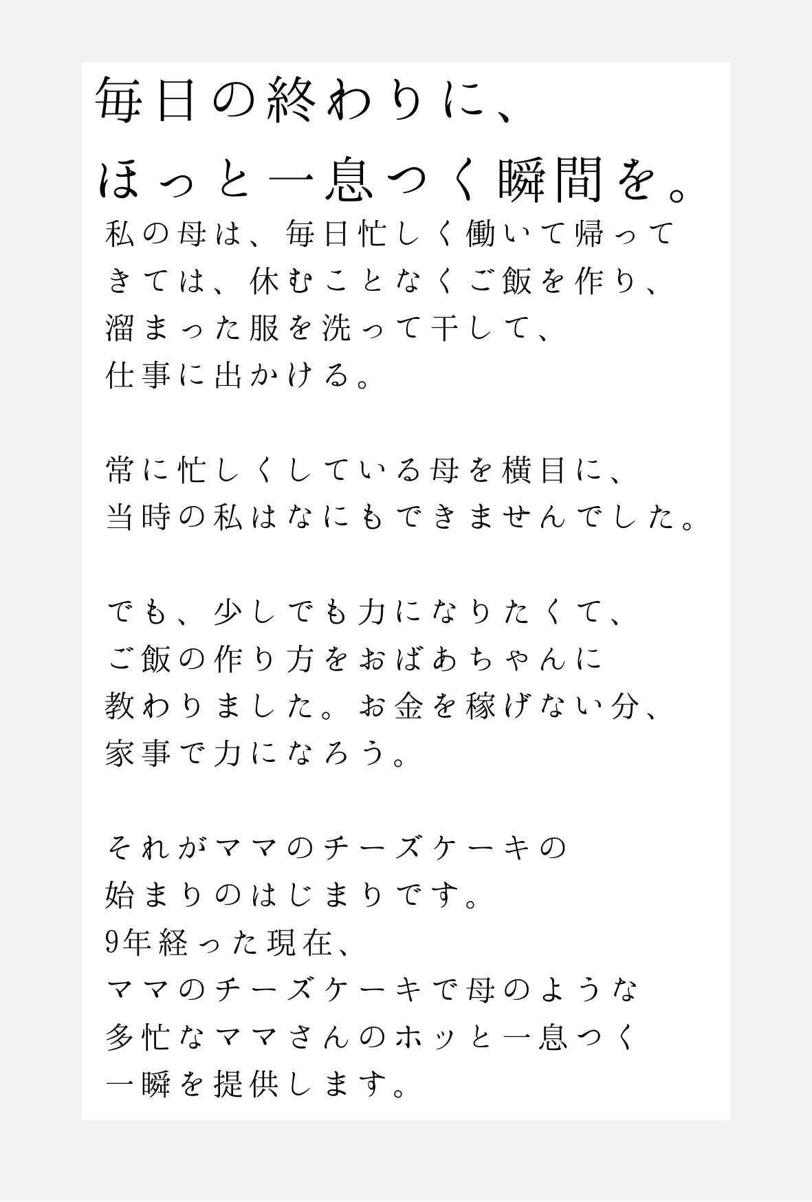 「毎日の終わりに、ほっと一息つく一瞬を。」をコンセプトとしたチーズケーキとガトーショコラ専門店です。インスタグラムでは「どこか懐かしい思い出のチーズケーキ」をテーマとした投稿をしております。商品コンセプトに「母への感謝」を込めておりますので、商品1つ1つ丁寧に焼き上げており、1梱包に1枚「メッセージカード」を同封しております。