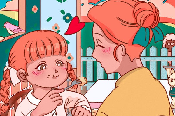 「午後5時、ママがパートから帰ってきて夜の仕事に行く前、ご飯を作り終わったところに、子どもが帰ってきて、2人で遅めのおやつとしてチーズケーキを楽しみ、今日の出来事や明日のことを話す。」