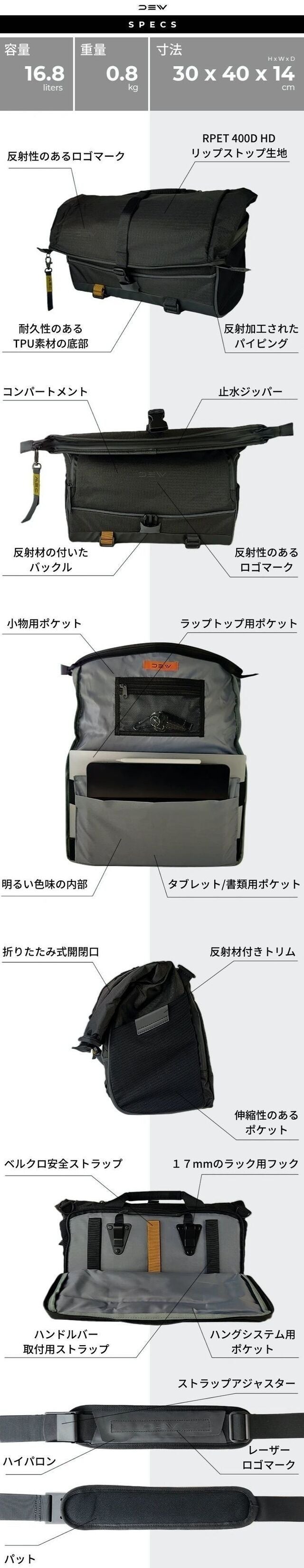 素材 :リサイクルポリエステル(RPET 400 D HD ripstop)
