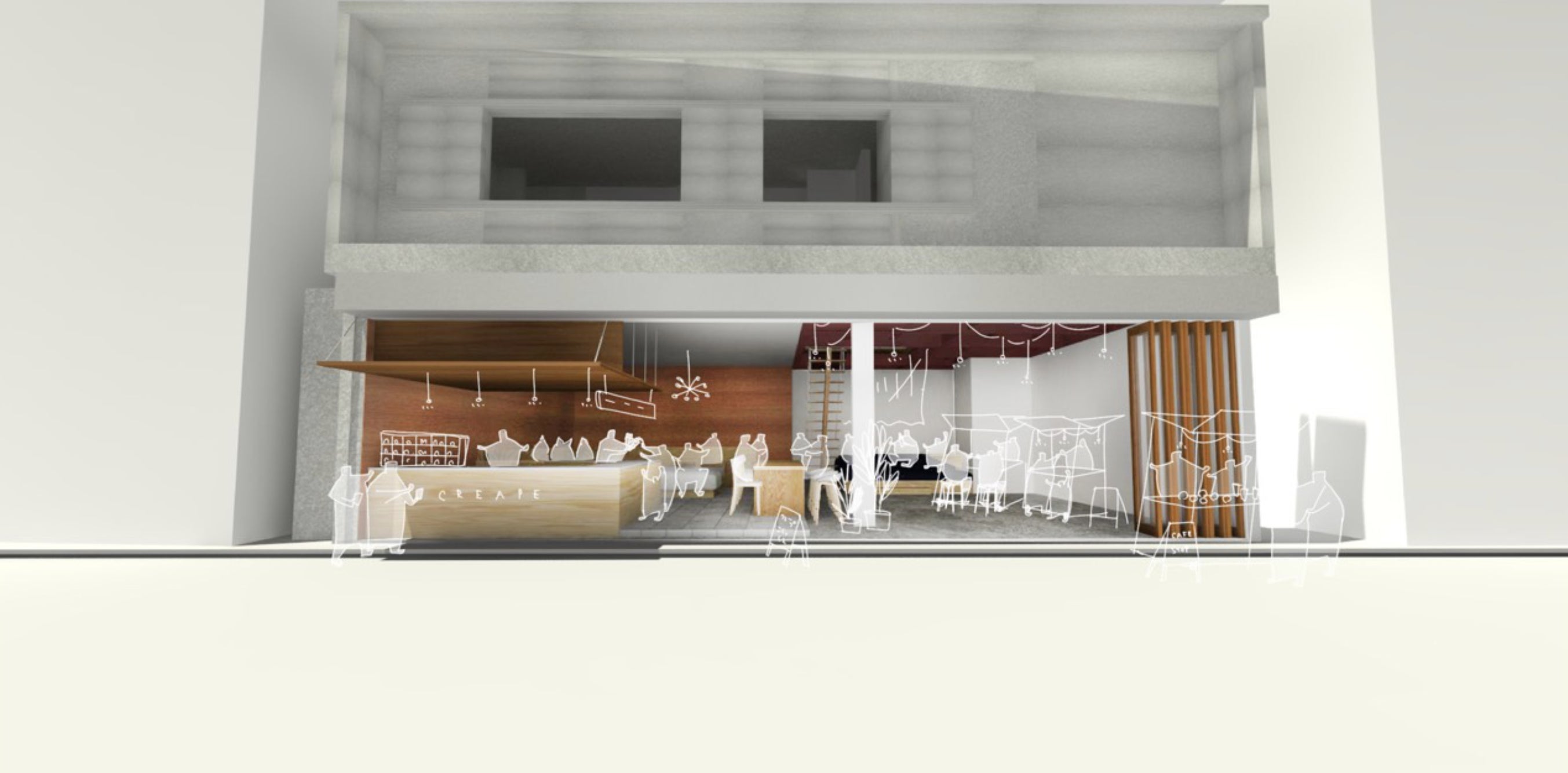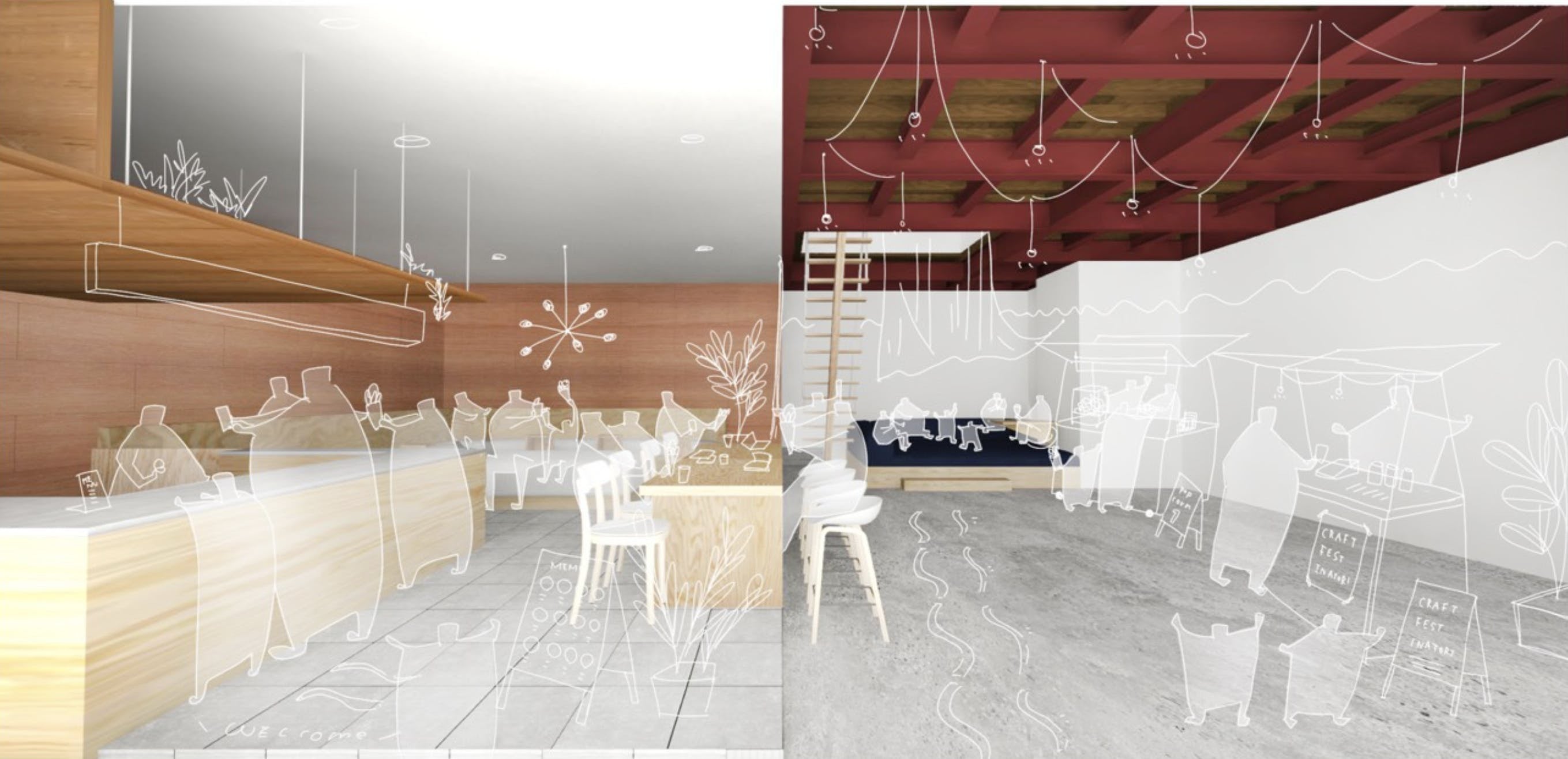 ここにつくるカフェは空間が半分に分かれ、左側が「カフェ」、右側が「屋内広場」になっています。