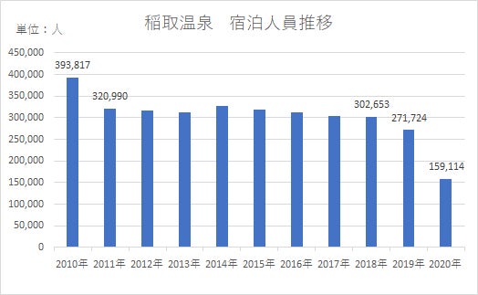 稲取温泉の宿泊人員推移。コロナによって半数以下に落ち込んでいる。