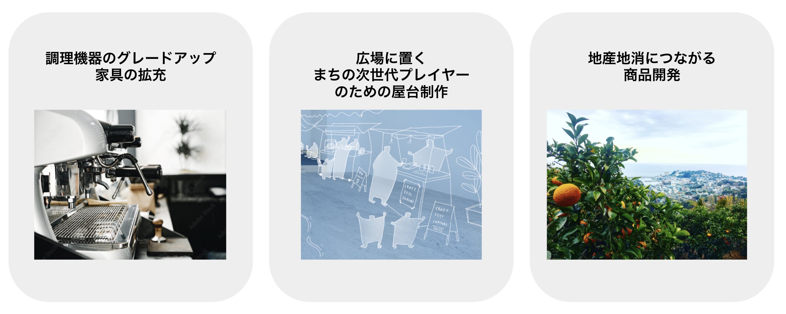右側の屋内広場では屋台を設置し、地元の食材の販売や、これから稲取で事業をしてみたい次世代プレイヤーの支援するための拠点にします。まずはこのカフェを成功させることですが、その先の次世代のプレイヤーに繋げていく仕組みを併設することで、一店舗の利益ではなく、今後のまちづくりへ繋げていくための施策を見据えた新業態カフェとしています。