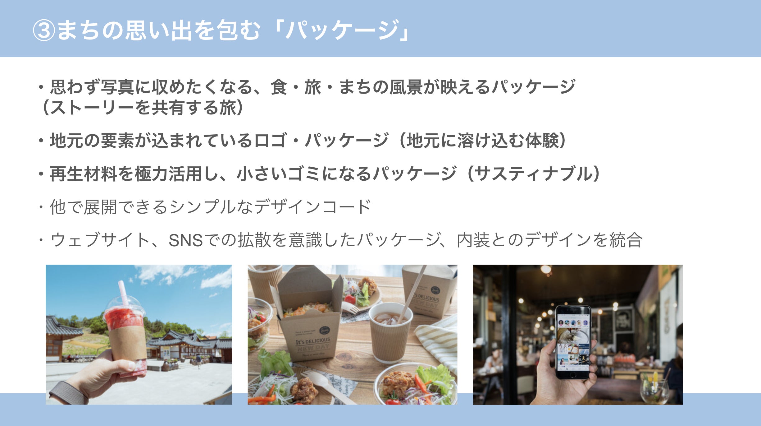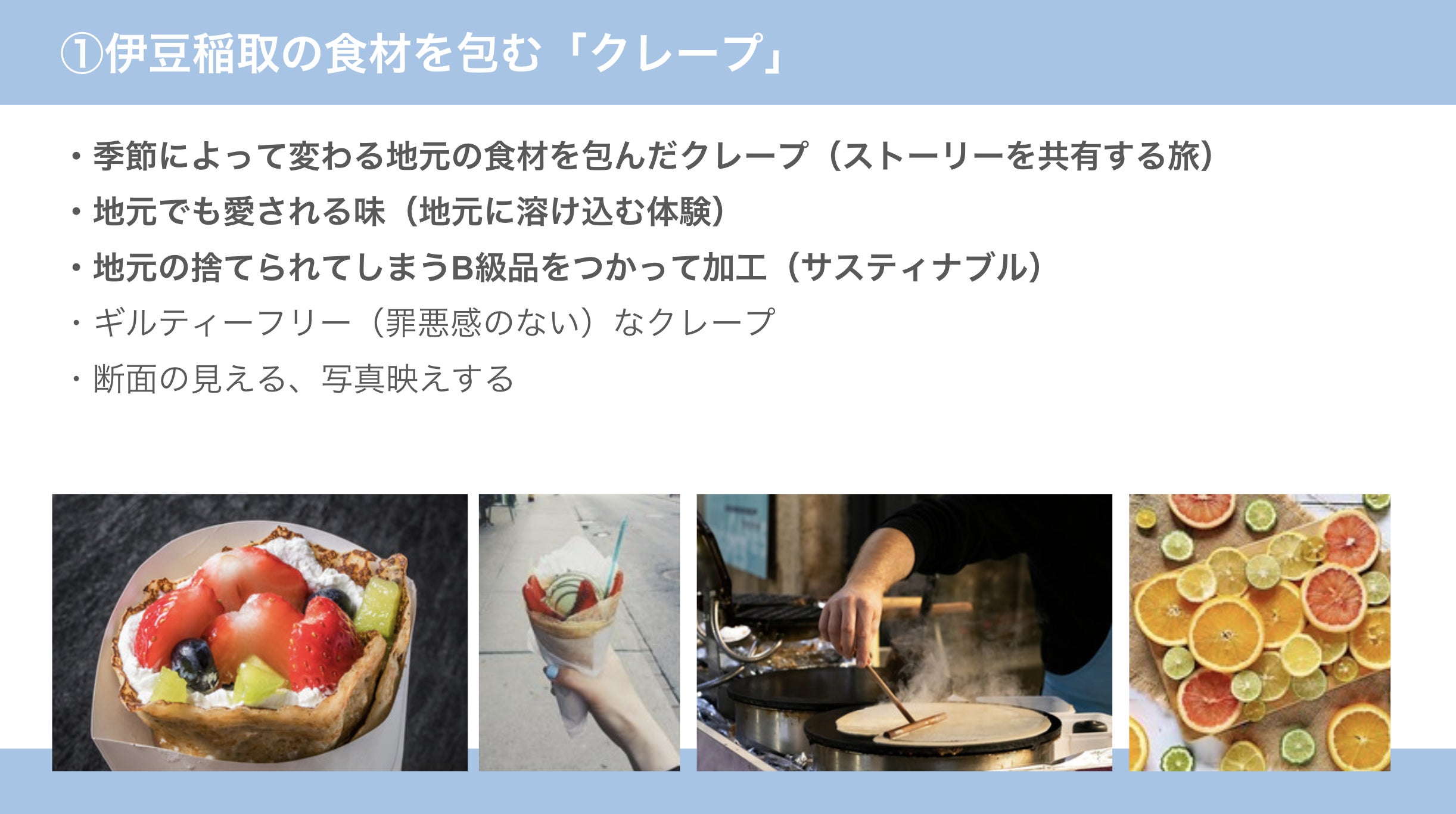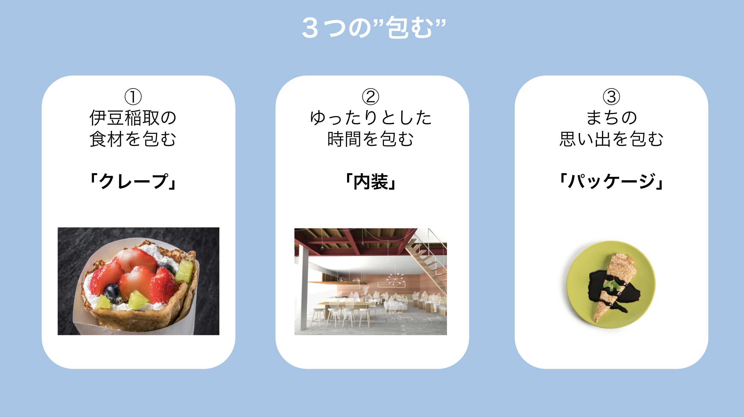 このカフェでは、3つの"包む"として、伊豆稲取の食材を包む「クレープ」を中心とした滞在型のカフェをつくるプロジェクトとして動き始めました。