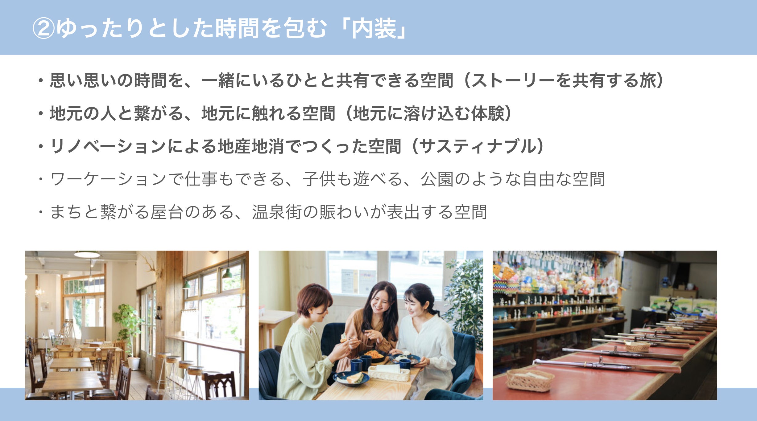 そして、そのディスカッションのアウトプットの第一弾として温泉街にある空き店舗をリノベーションして「新業態カフェ」をつくり、私たちの目指すべき温泉街の姿をまずかたちにしていくことにしました。